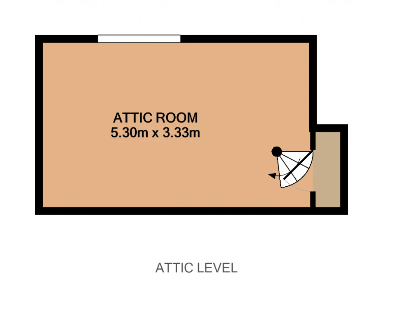 Attic Level 5.30 x 3.33 The converted attic offers great storage space or could equally be used as a study / home office. There is wooden paneling to the walls and ceiling, carpet flooring, custom storage area and centre light. The converted attic is bright and airy, with CUH within view.