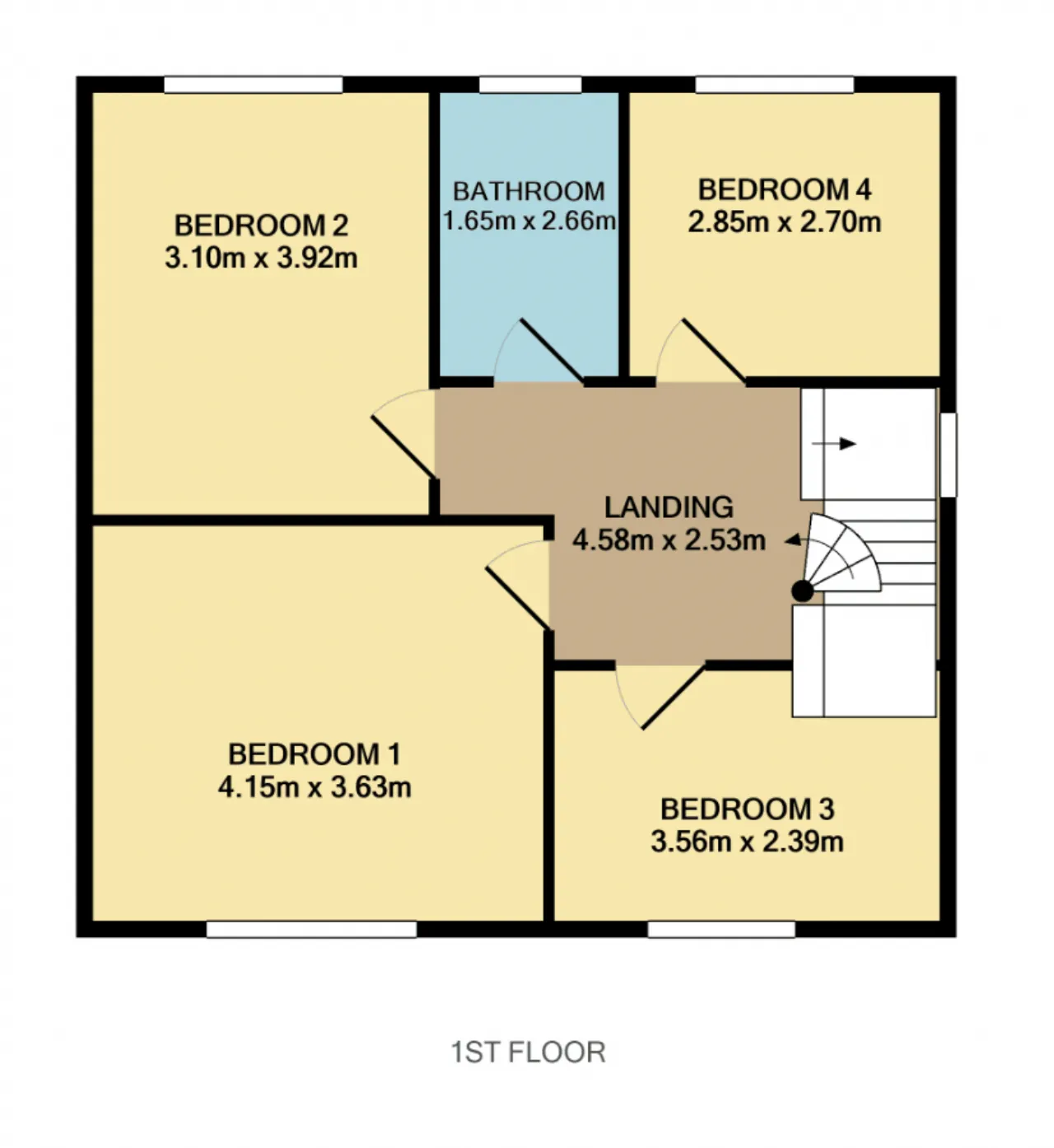 Bedroom 1 4.15 x 3.63 Large double bedroom overlooking the front garden with carpet flooring and centre light.