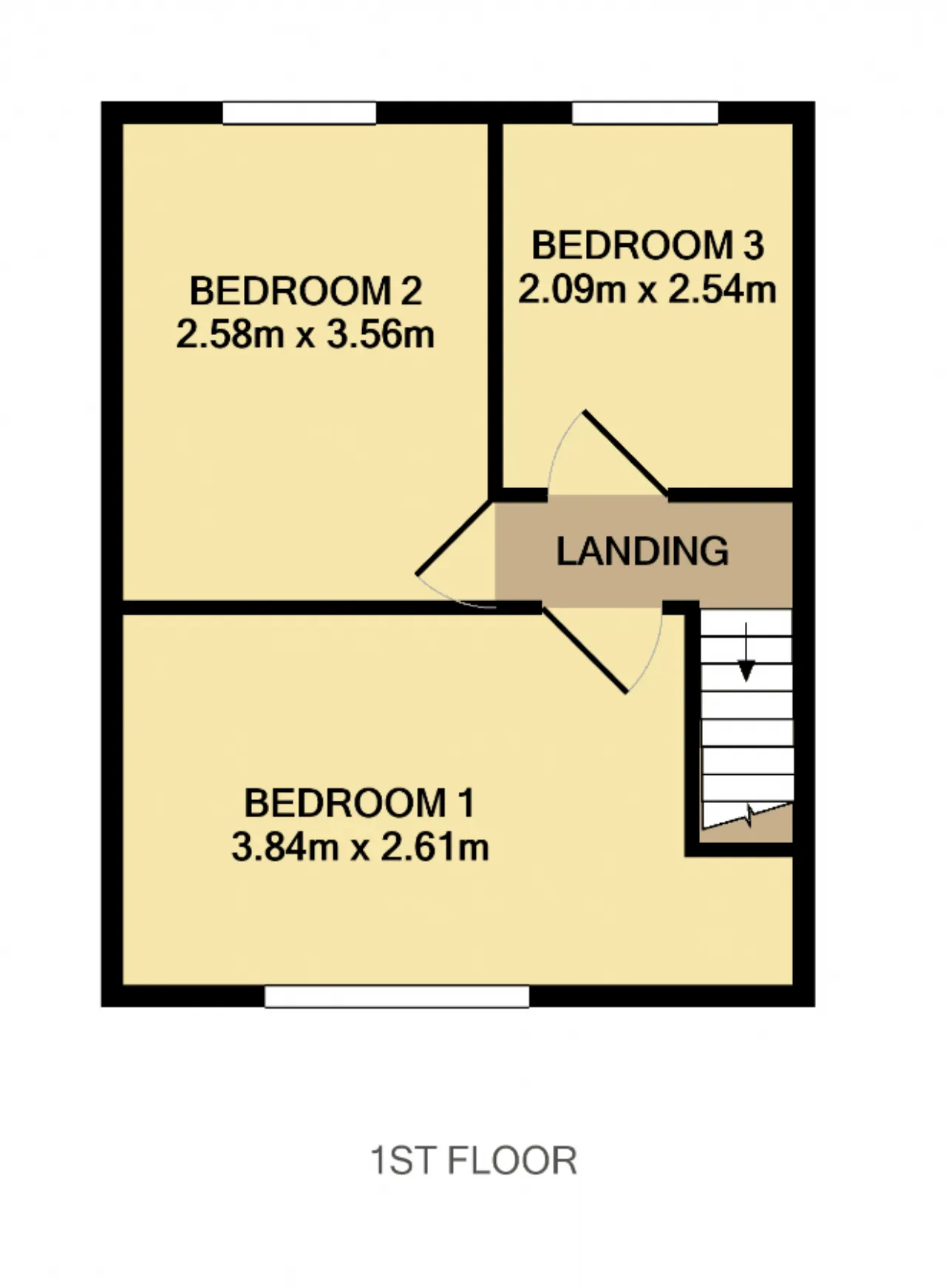Bedroom 1 3.84 x 2.61 Large double bedroom to the front of the house with carpet flooring, fitted wardrobe and centre light.