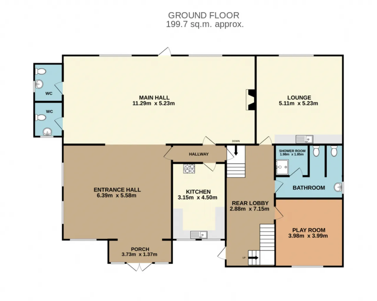 Main Hall 11.29m x 5.23m The bright and expansive main hall acts as the focal point of this property. It provides a wealth of space for any kind of activities and offers direct access to the school room, W.Cs and the outdoor playground area. This large hall features wooden flooring, celing light fixtures, storage cupboards and a fireplace.