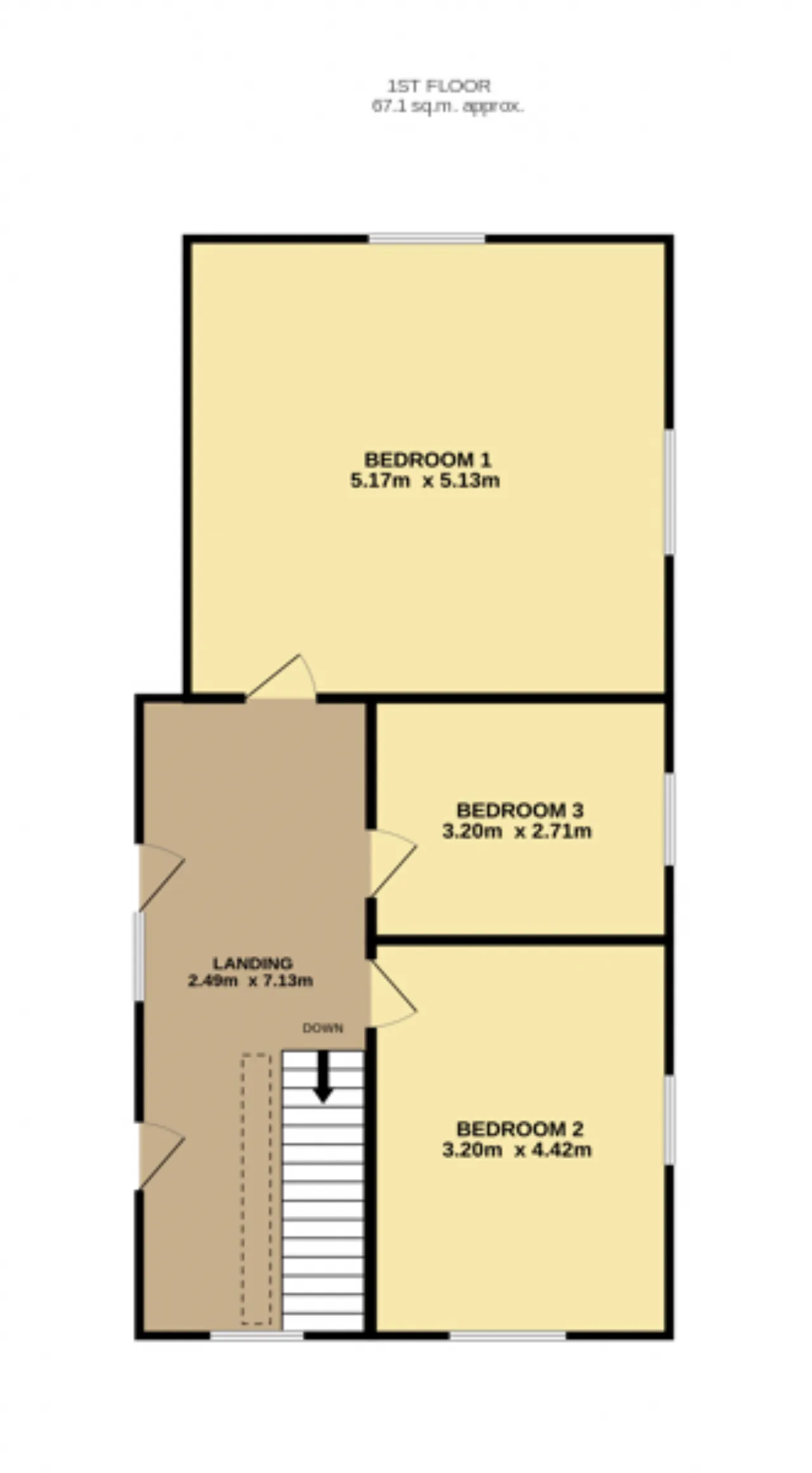 Landing 2.49m x 7.13m The bright and airy landing provides access to the rest of the upstairs, and offers carpet flooring, Velux windows, ceiling light fixture and access to a generous storage area and the attic via a stira.