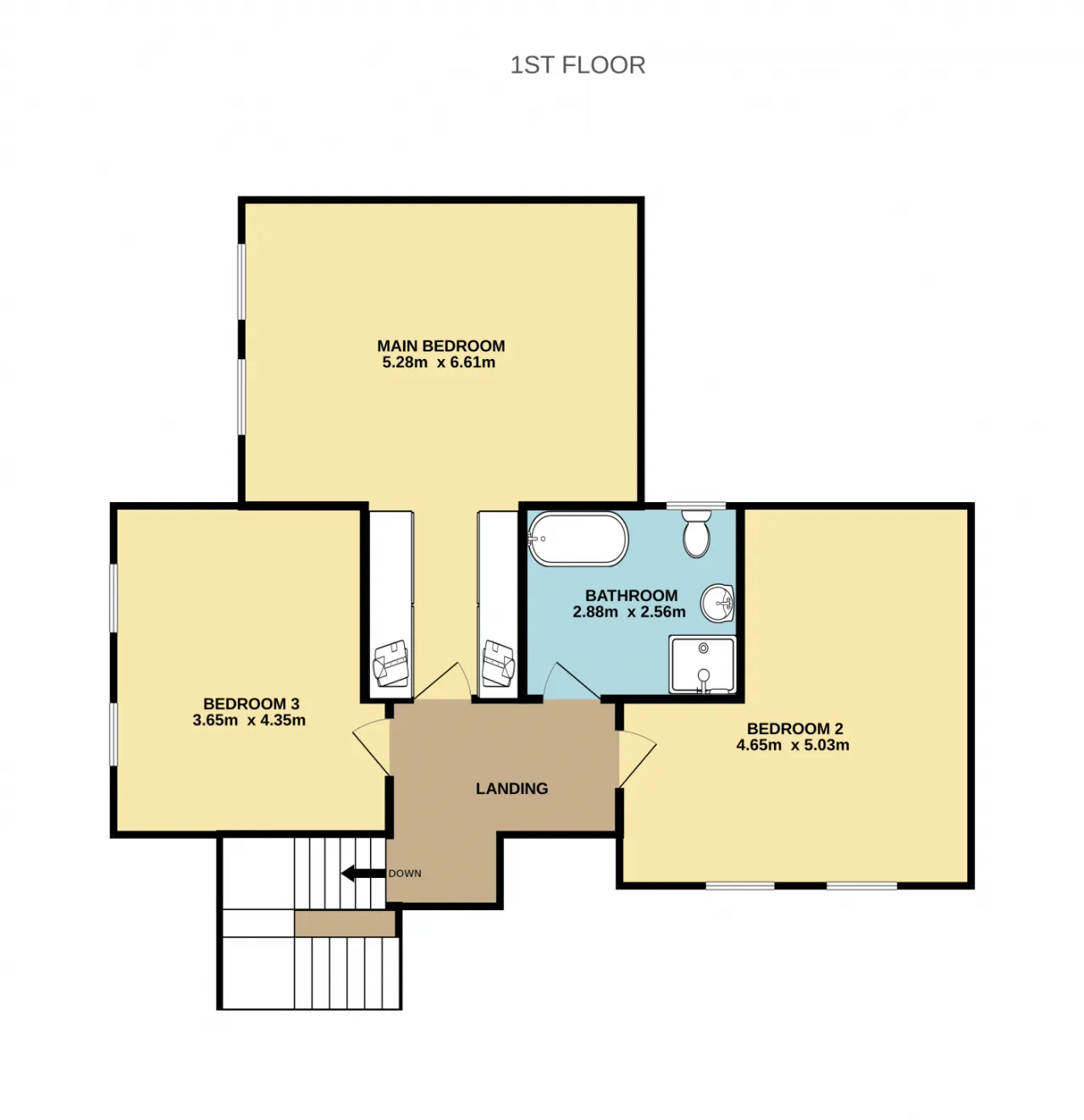 Bedroom 2 4.65m x 5.03m Another well-sized double room with a window to the front of the property, wood flooring and a built-in wardrobe.
