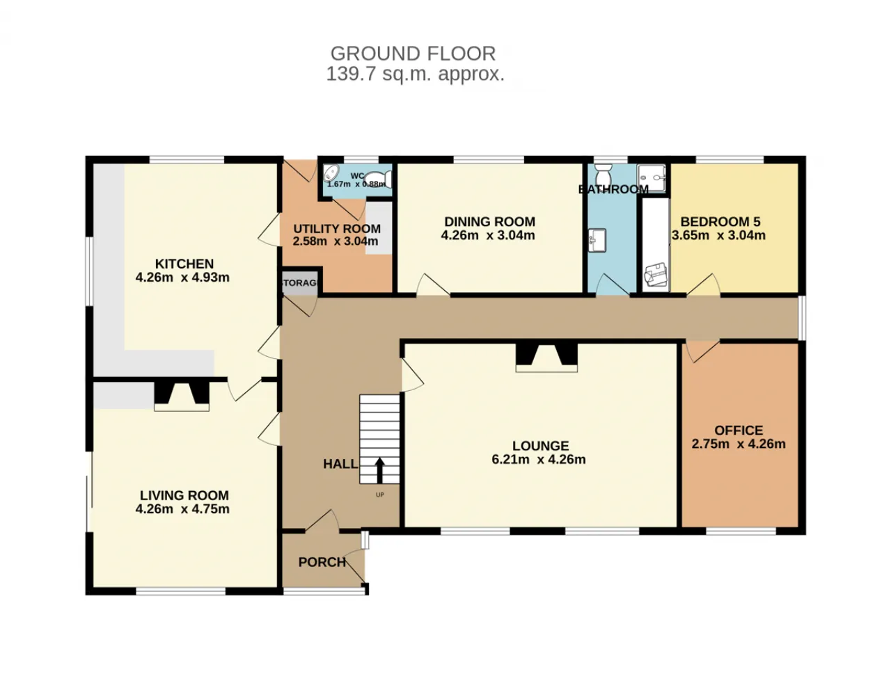 The internal layout offers a great balance of living and bedroom accommodation. Downstairs comprises of a porch, wide entrance hallway, three large reception areas, a large kitchen/ breakfast room, utility room with guest WC, office, downstairs bedroom and bathroom. The interconnecting reception rooms create a flow throughout the ground floor and allow easy circulation for family life and entertaining. Upstairs there is a spacious landing, four generously proportioned bedrooms each enjoying views over the gardens, main bathroom and master ensuite.