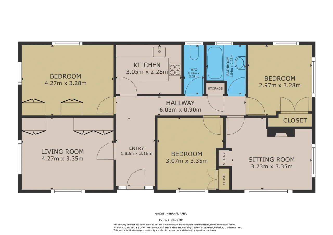 The accommodation includes entrance hallway, kitchen, living room, sitting room, 3 bedrooms and family bathroom.