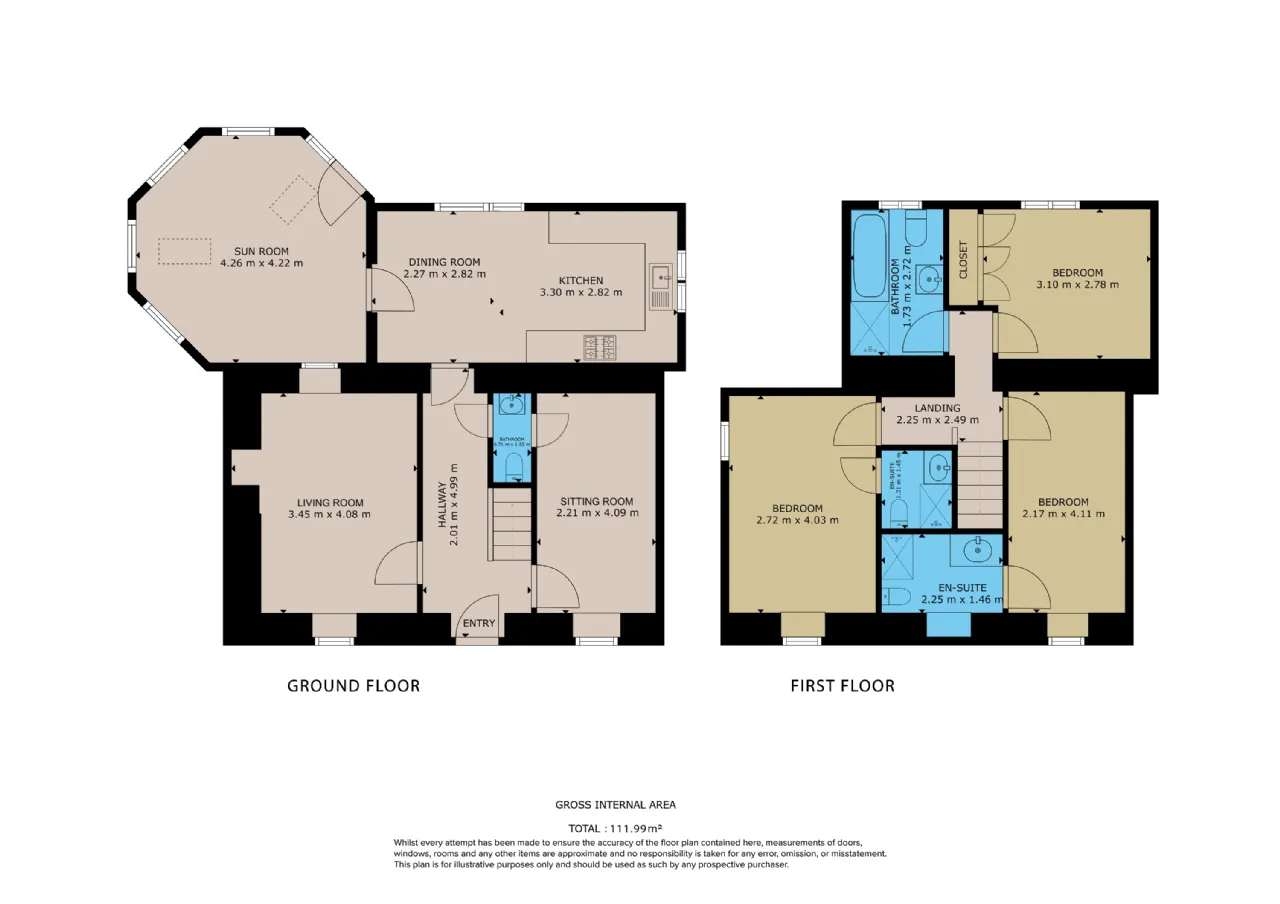 The accommodation comprises an entrance hallway, sitting room, living room, open-plan kitchen and dining area, sunroom and guest W.C. on the ground floor. The sitting room on the ground floor can also used as a fourth bedroom as it conveniently has its own door access to the guest WC. Upstairs are three double bedrooms, two with en-suite bathrooms, plus a separate family bathroom.