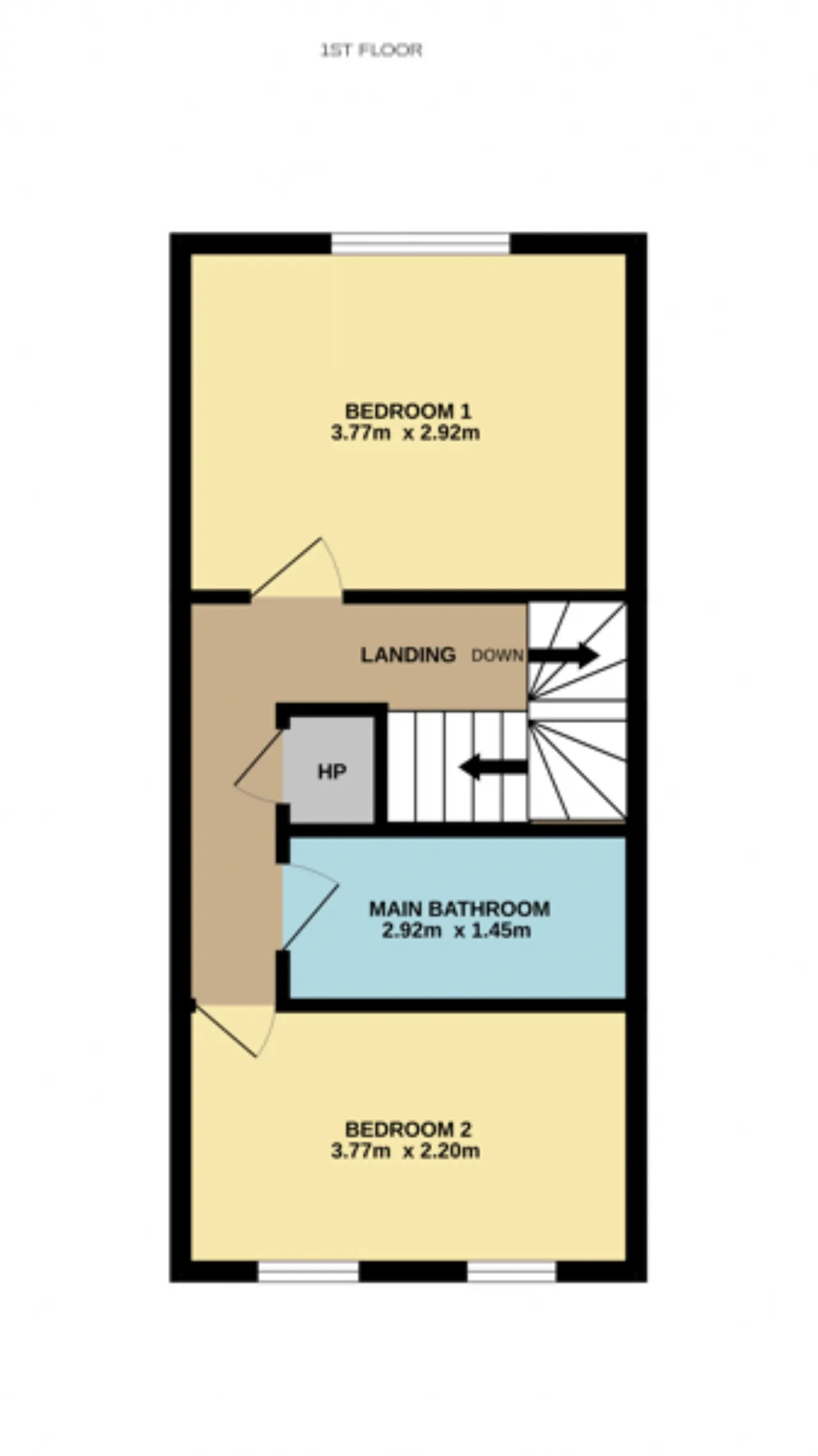 Landing 3.63m x 0.92m x 3.76m The landing gives access to two bedrooms, a hot press and the main bathroom.