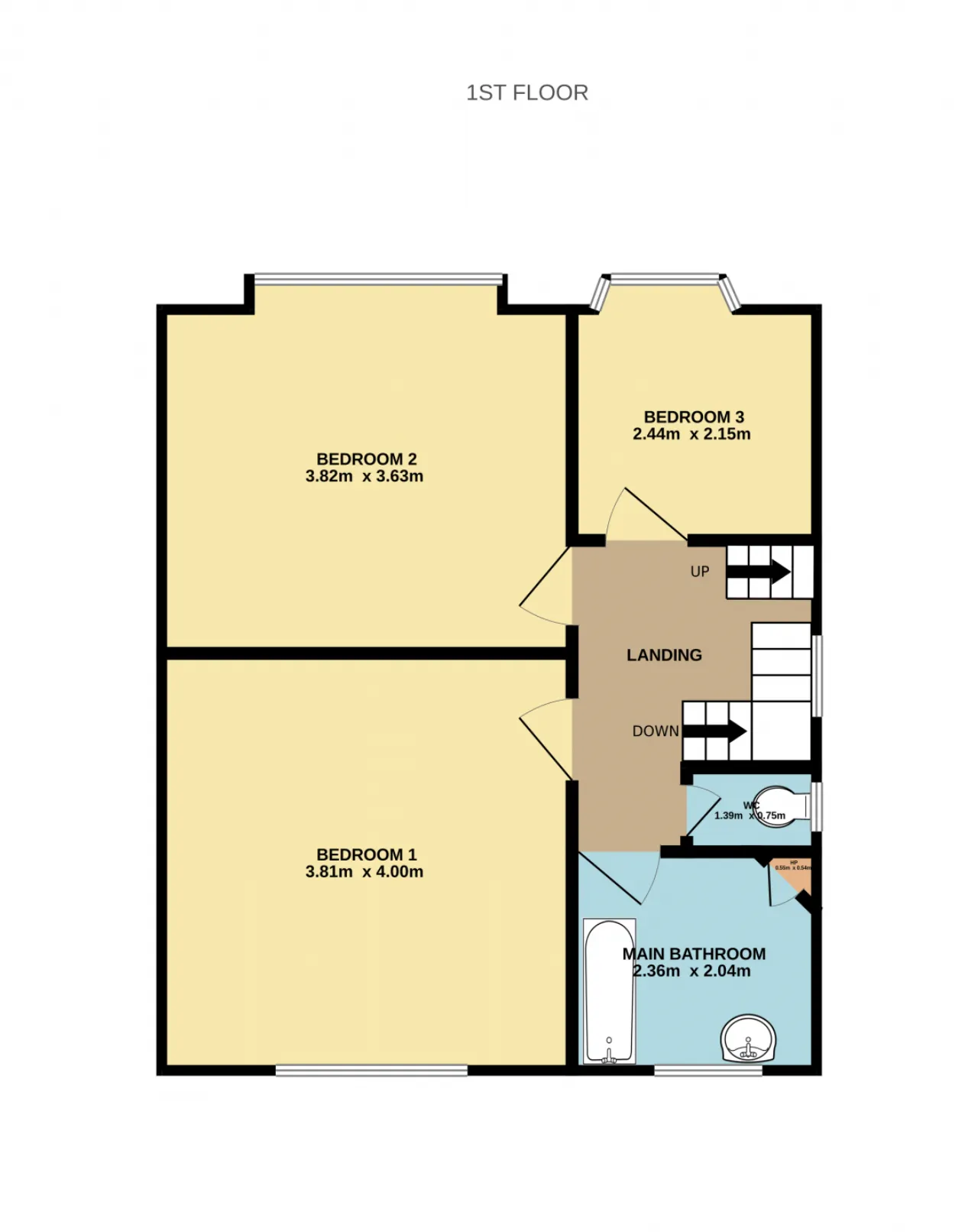 Bedroom 3 2.44m x 2.15m Single bedroom with a bay window that overlooks the front garden and features original solid wood flooring.