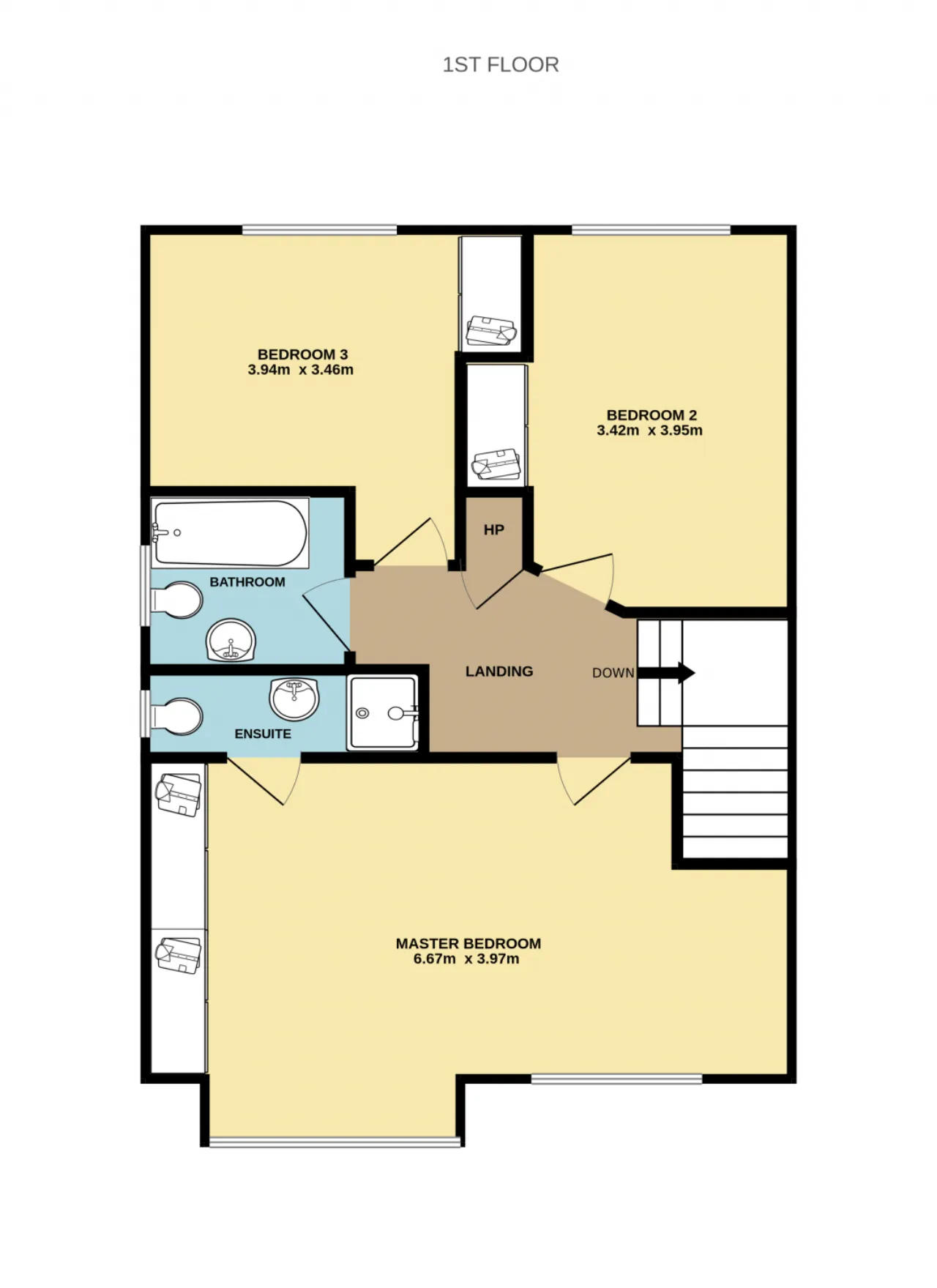 Master Bedroom 6.67m x 3.97m Originally designed as two separate bedrooms, the current owners have cleverly reconfigured this space to create a large master bedroom spanning the full width of the home. Positioned to the front, it overlooks the green and surrounding woodland. The room features wood flooring, two large windows allowing for ample natural light, wall-to-wall wardrobes and access to the ensuite.