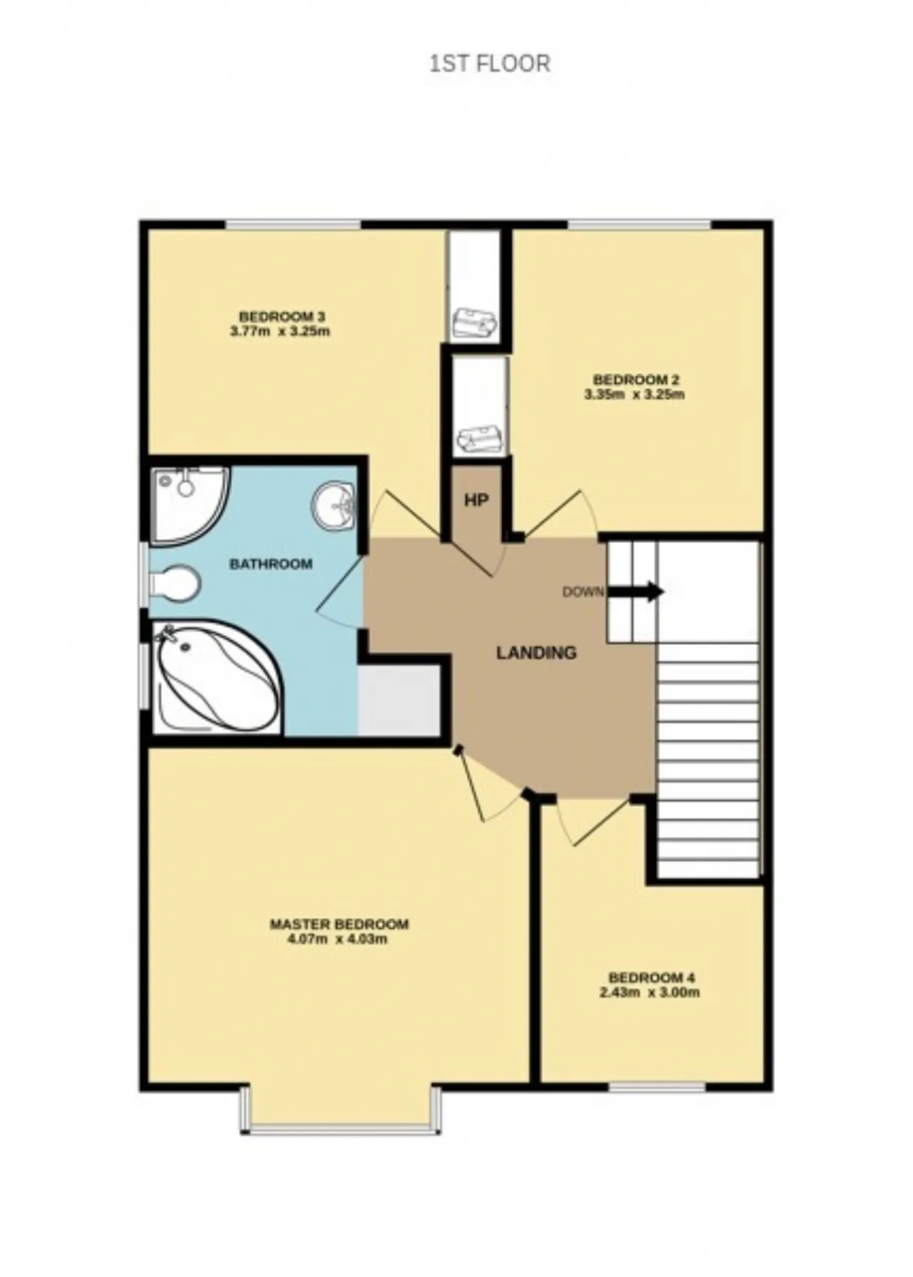 Landing A carpet staircase leads to a spacious landing providing access to four bedrooms, family bathroom and the hot press.