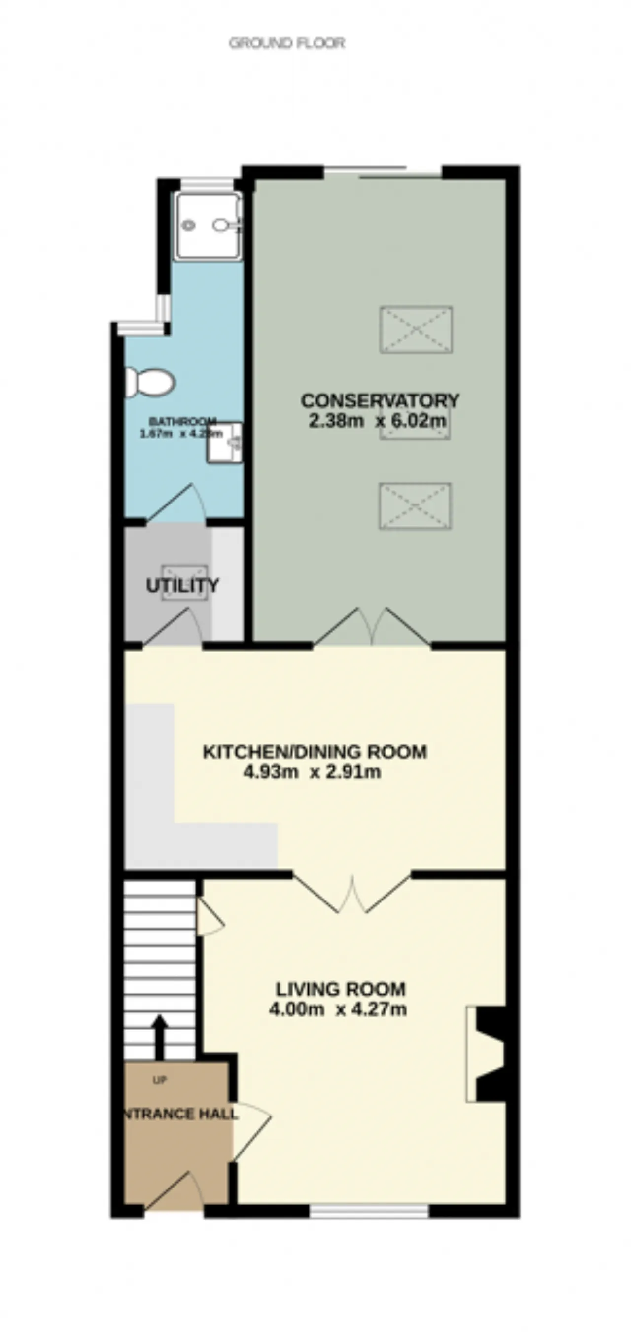 Kitchen/ Dining Room 4.93m x 2.91m The kitchen/ dining room is bright and airy, fitted with shaker style floor and eye level units, tiled splashback and ample countertop space. There is tiled flooring, glazed double doors to the conservatory and access to the utility.