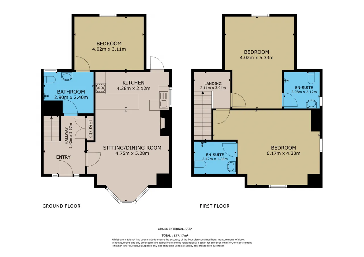The ground floor is laid out with large entrance hallway, spacious kitchen / living / dining room and has the benefit of a downstairs bedroom and inter-connecting bathroom. The first floor has 2 exceptionally generous bedrooms both having their own en-suite facilities.