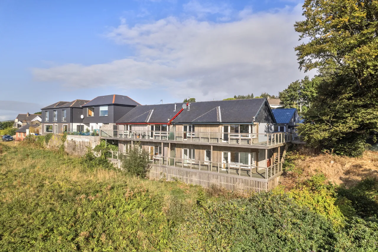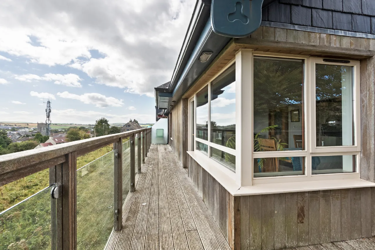 The grounds are designed for low maintenance with wrap around timber cladded steel balconies on both the first and ground floors to take in the southerly views over the town and bay. Parking is available in front of the house.