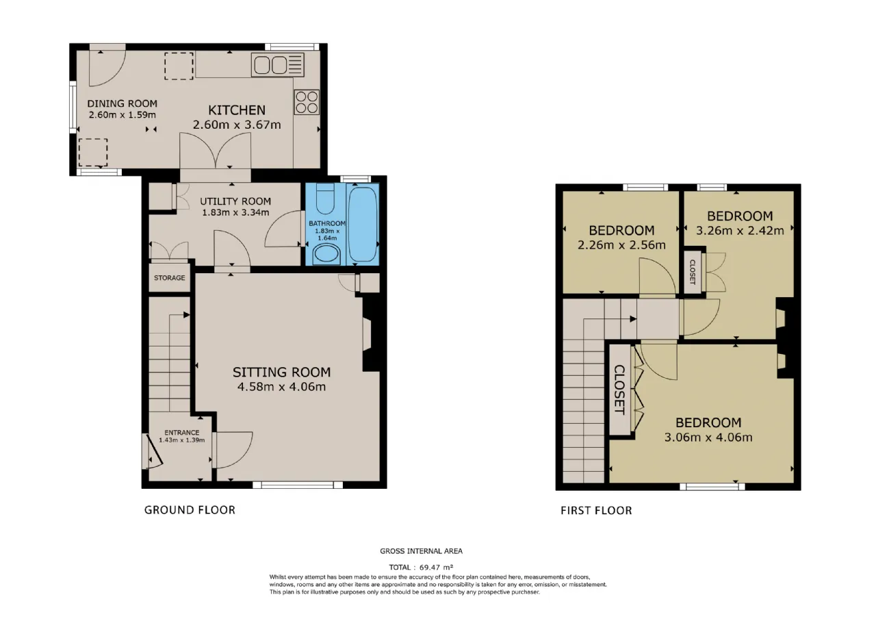 The accommodation comprising 748 sq. ft. / 69.47 sq. mtrs. approximately includes entrance hall, living room, kitchen / dining room, utility and bathroom on the ground floor. The first floor includes 3 bedrooms.