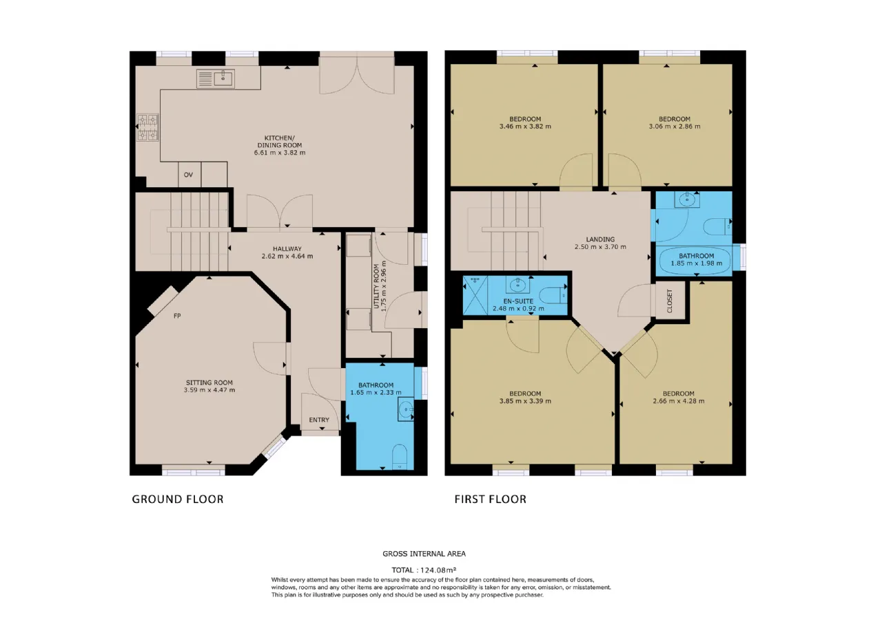 The accommodation comprises Entrance Hallway, Living Room, Kitchen/Dining Room, Utility and Guest WC on the ground floor. The first floor includes 4 Bedrooms with master ensuite and family bathroom.