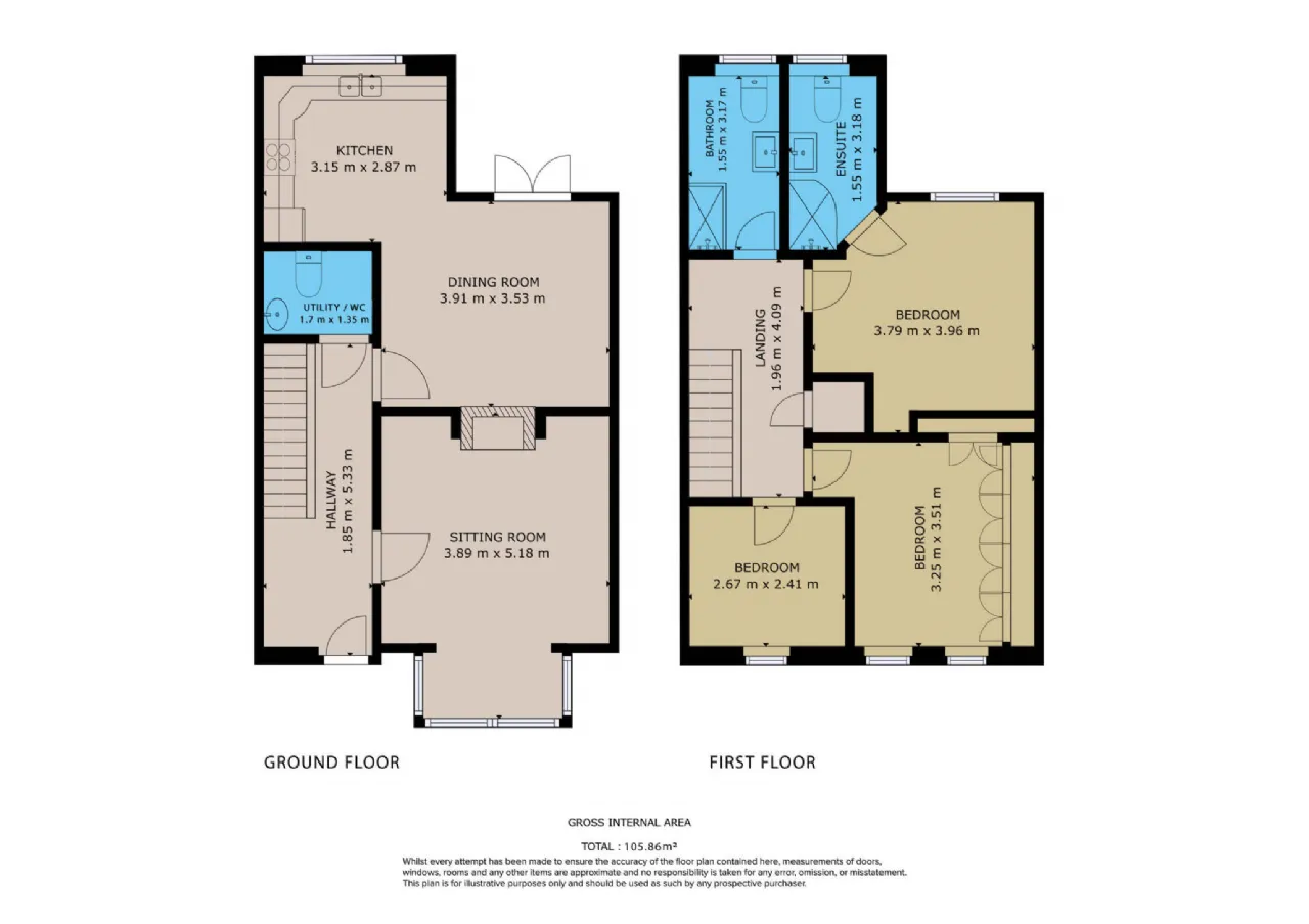 Upstairs, there are three bedrooms including the master bedroom which features a recently upgraded en-suite bathroom while built-in wardrobes provide plenty of storage. The main bathroom is elegantly designed, featuring a sleek shower and modern fixtures. A convenient WC on the ground floor has room for the washing machine and dryer which adds to the practicality of this home.