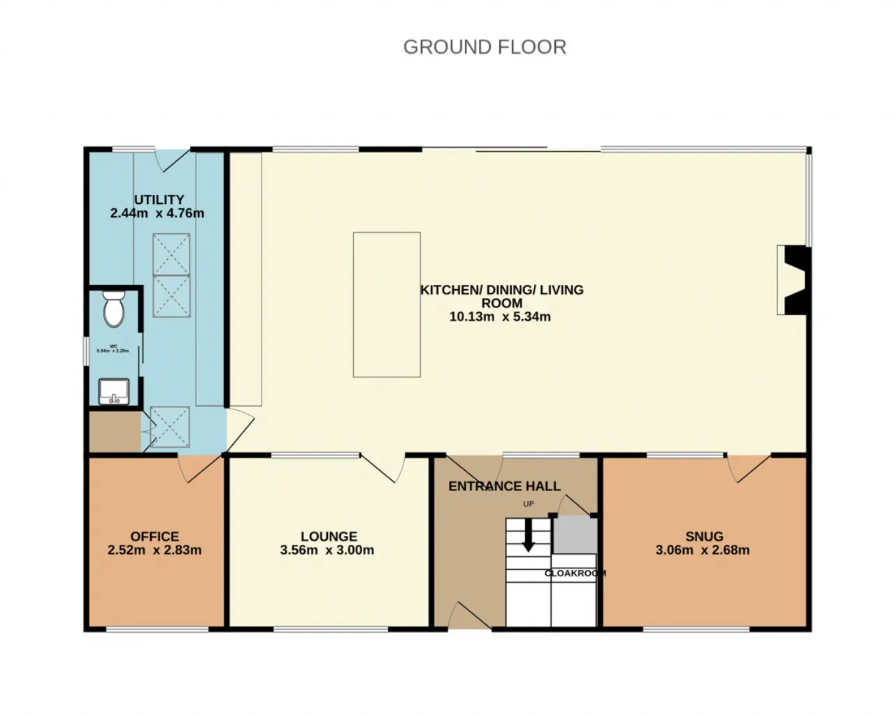 Office 2.83m x 2.52m This is a good-sized room to the front of the home overlooking the front patio, which is accessed from the kitchen area. It benefits from a large window flooding the space with natural light.
