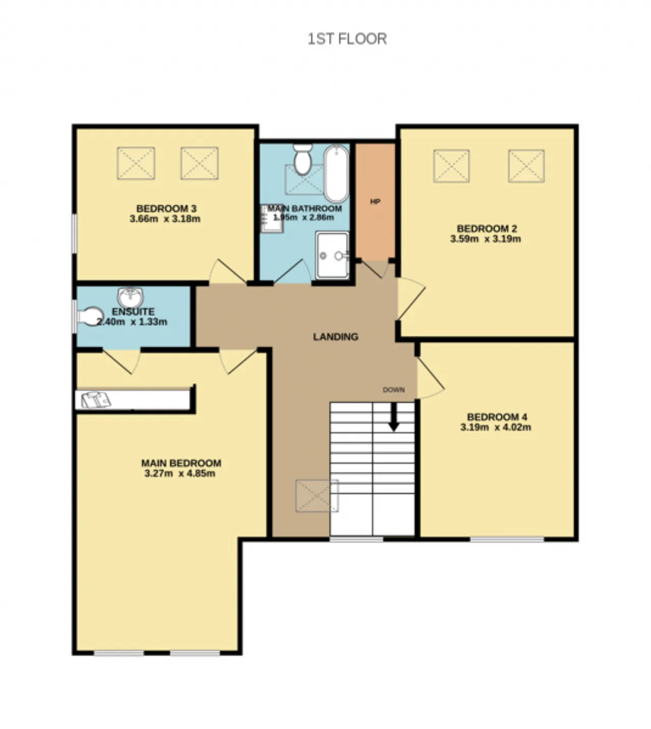 Main Bedroom 3.27m x 4.85m Large double bedroom with a window overlooking the front driveway, carpet flooring, walk in wardrobe area and an ensuite.