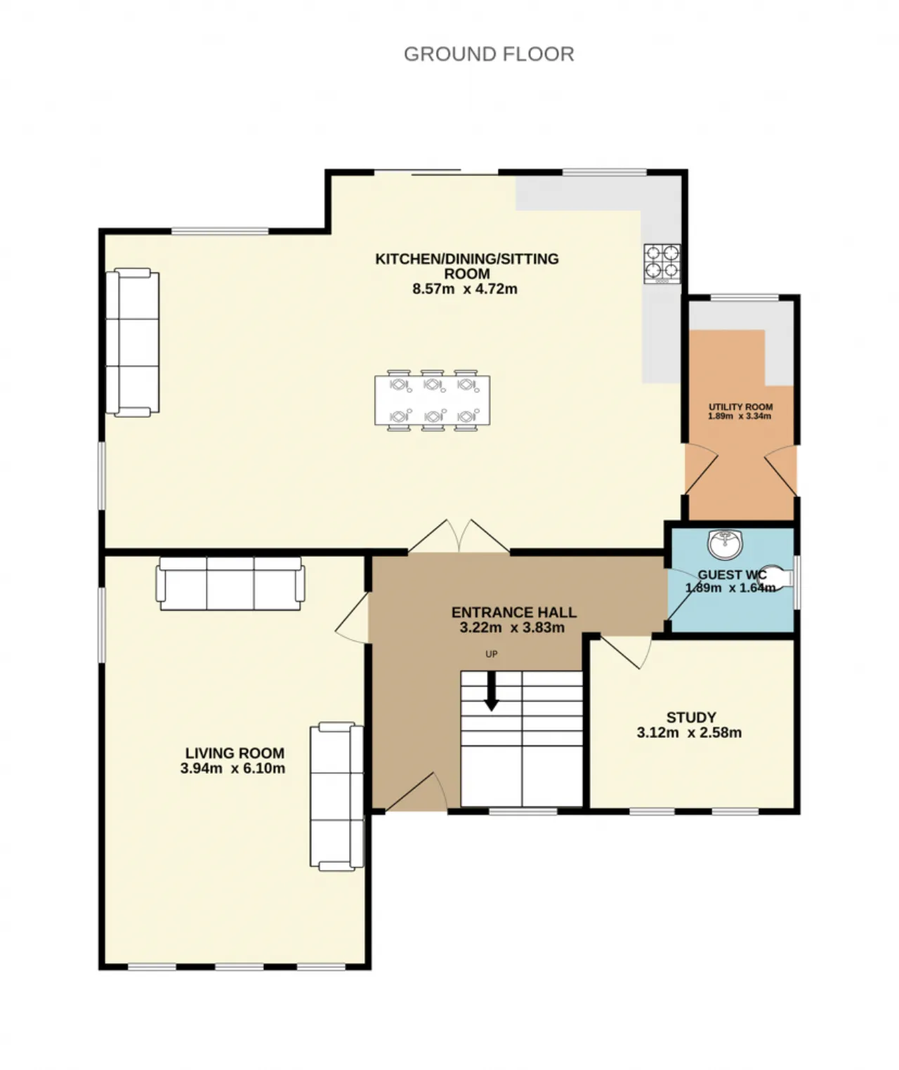 Study/Playroom 3.12m x 2.58m The generous home office, which could also be used as a playroom or an additional reception room. It features two windows which overlook the front driveway and benefits from laminate wood flooring.