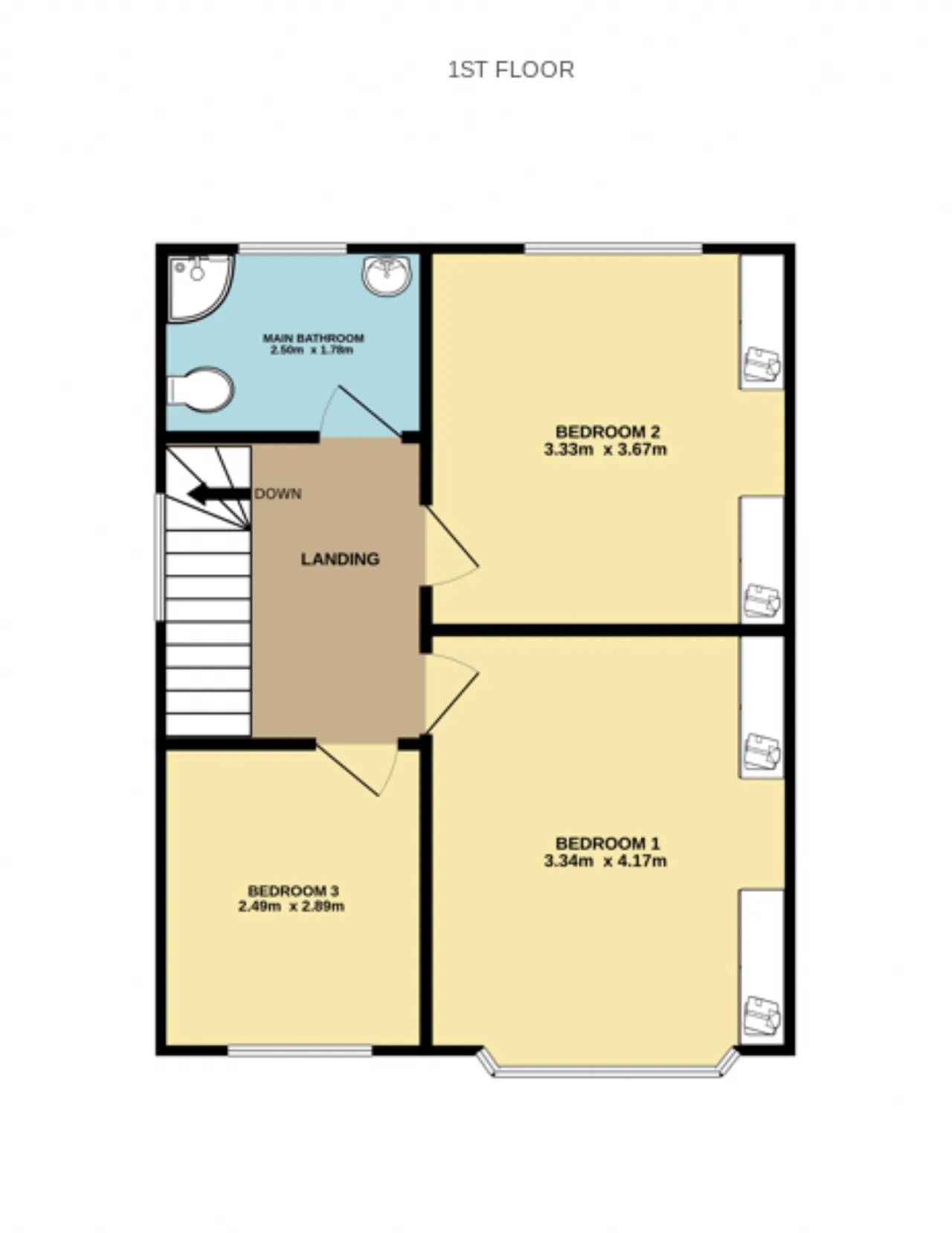 Landing 2.52m x 2.10m Spacious landing area with a large gable window that fills the area with natural light. The landing provides access to all three bedrooms on first floor along with the family bathroom and Stira stairs to the fully floored attic space.