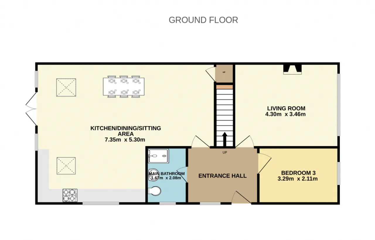 The ground floor consists of an inviting entrance hall, a generous living room, the third bedroom (currently being used as an office), the main bathroom and a bright and spacious open plan kitchen/dining/sitting area.