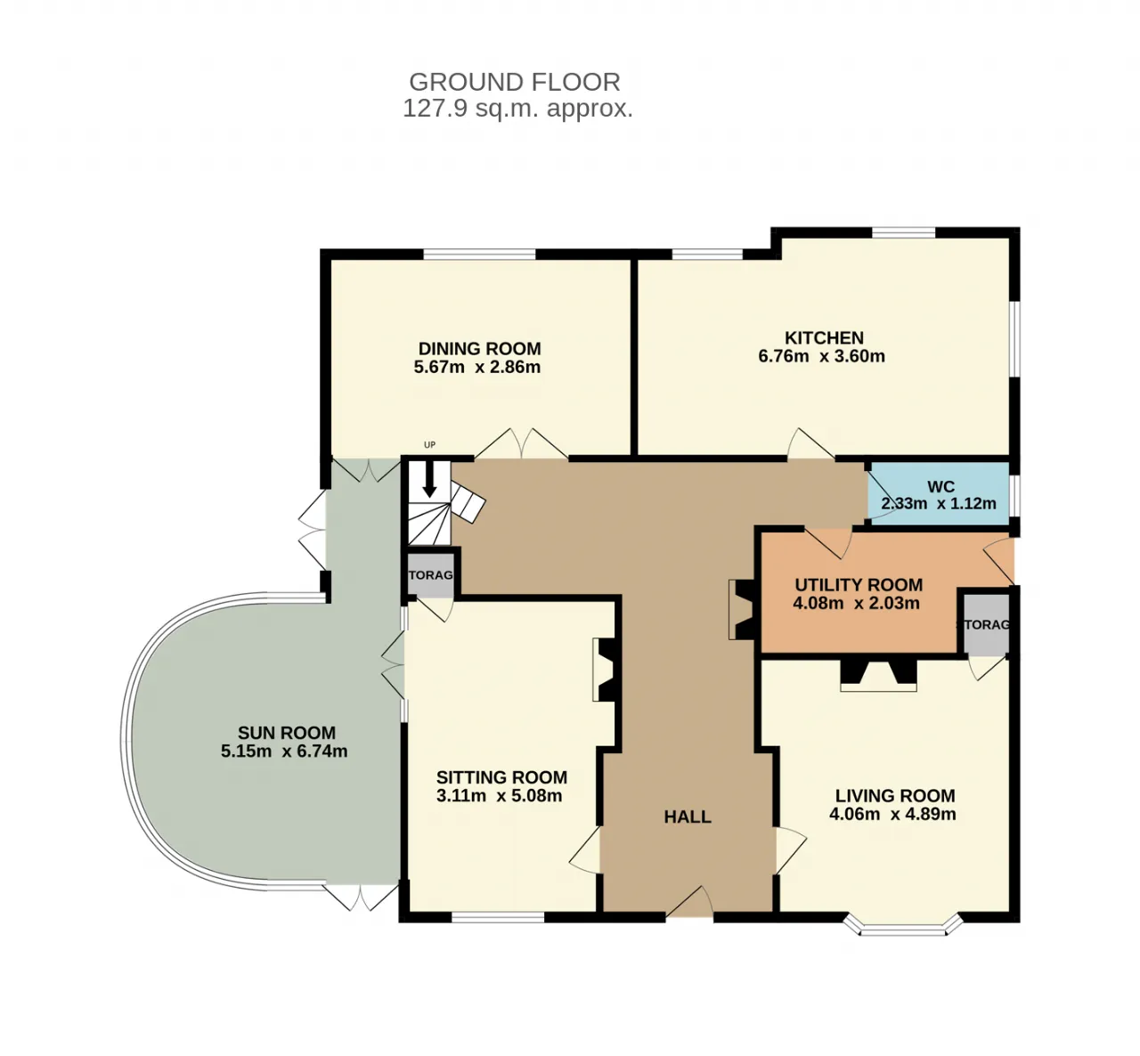 Sun Room 5.15m*6.74m Stunning curved design sun room that takes advantage of the south west aspect flooding the space with light and looks over the front and side gardens. Features wood flooring.