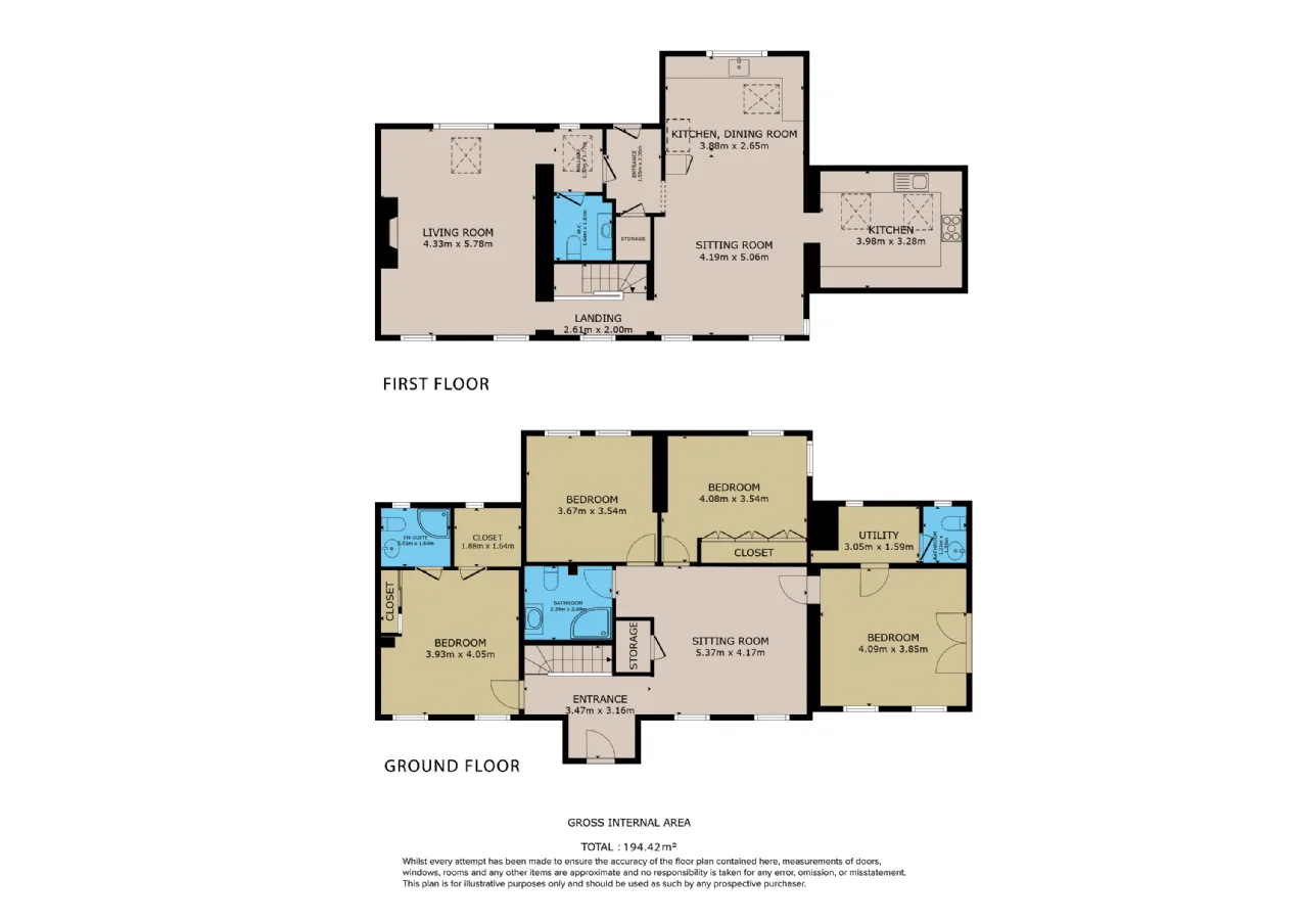 The ground floor accommodation includes a spacious master bedroom with en-suite and dressing room, two further generously sized double bedrooms, and a stylish family bathroom. Additional features include a utility room and a separate wc. A comfortable living room and a versatile den / fourth bedroom, complete the ground floor, offering ideal spaces for relaxation and family living.