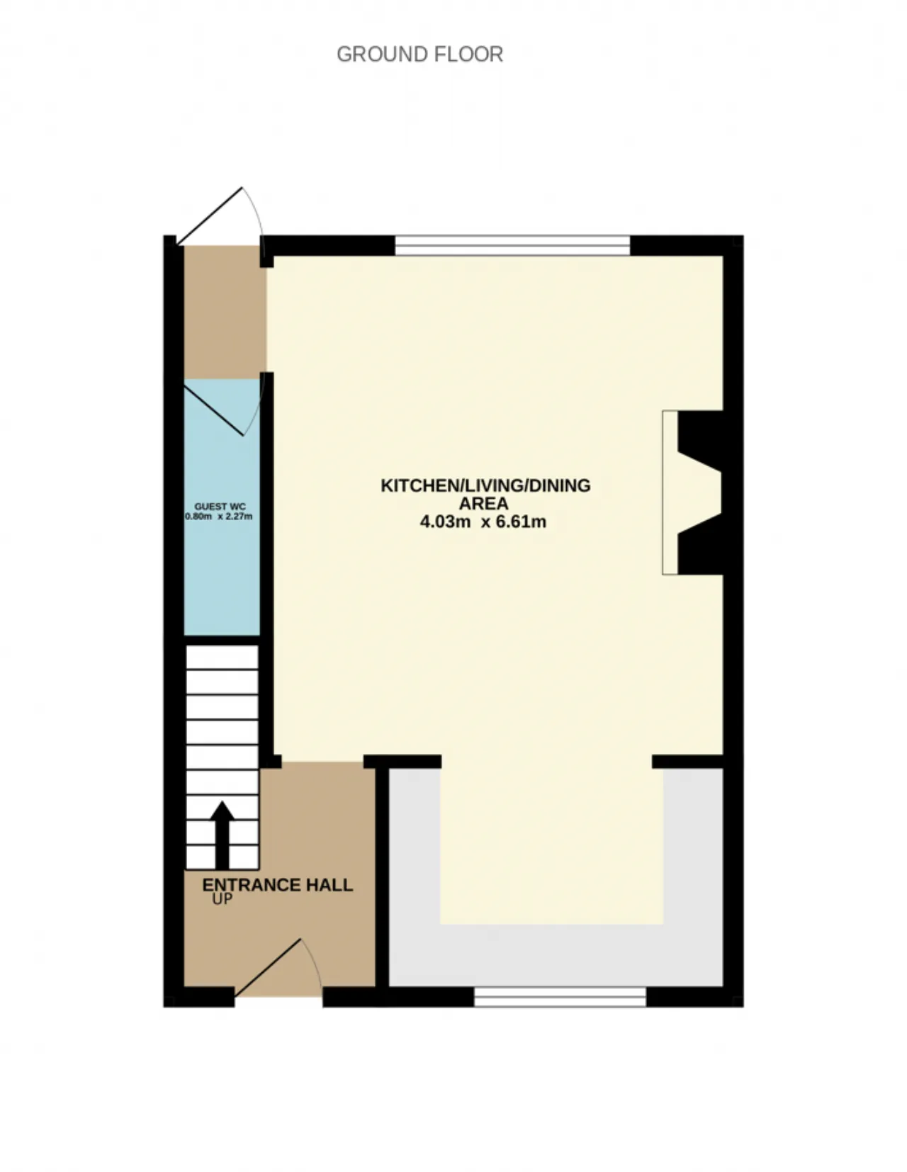 Guest WC 0.80m x 2.27m Fully tiled two-piece suite with electric ventilation.