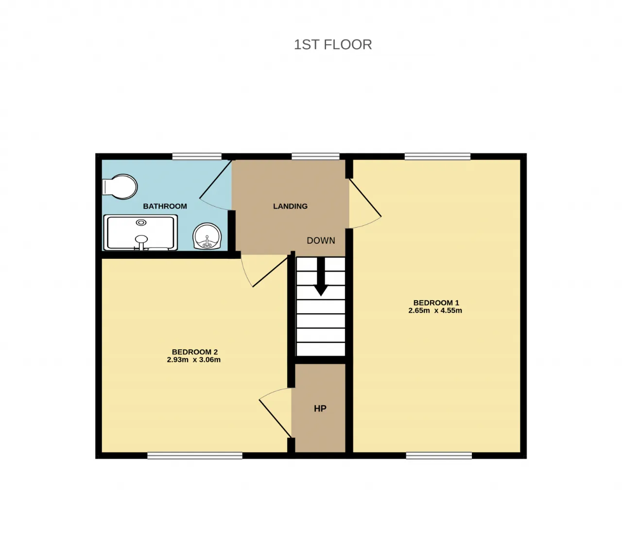 Bedroom 1 4.55m x 2.65m A generously proportioned double bedroom, featuring a dual-aspect design that spans the full width of the home. It is finished with laminate wood flooring and built-in display shelving.