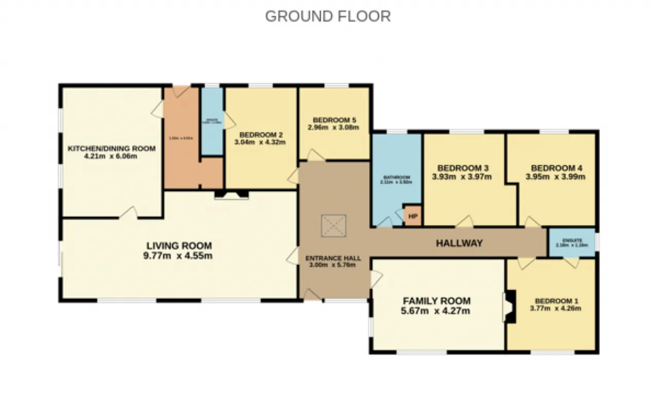 The accommodation includes a hallway, living room, family room, kitchen/dining room, utility room, five bedrooms (two with en-suite bathrooms), and a family bathroom.