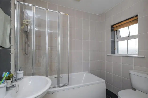 Bathroom 2.05m x 2.07m Fully Tiled. Bath with Electric shower. Whb and Toilet.