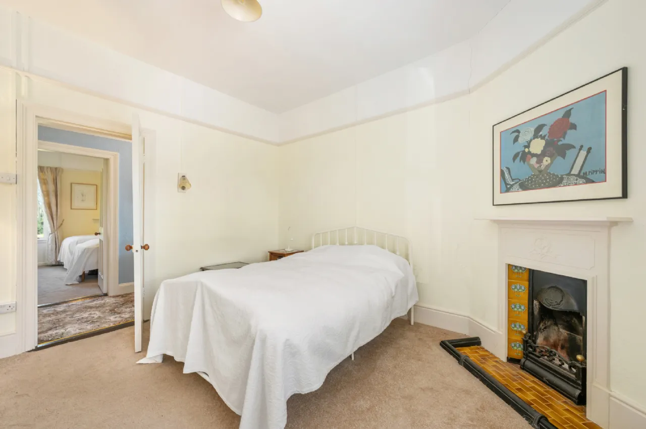 Bedroom 1 3.68m x 4m Carpet. Feature fireplace.