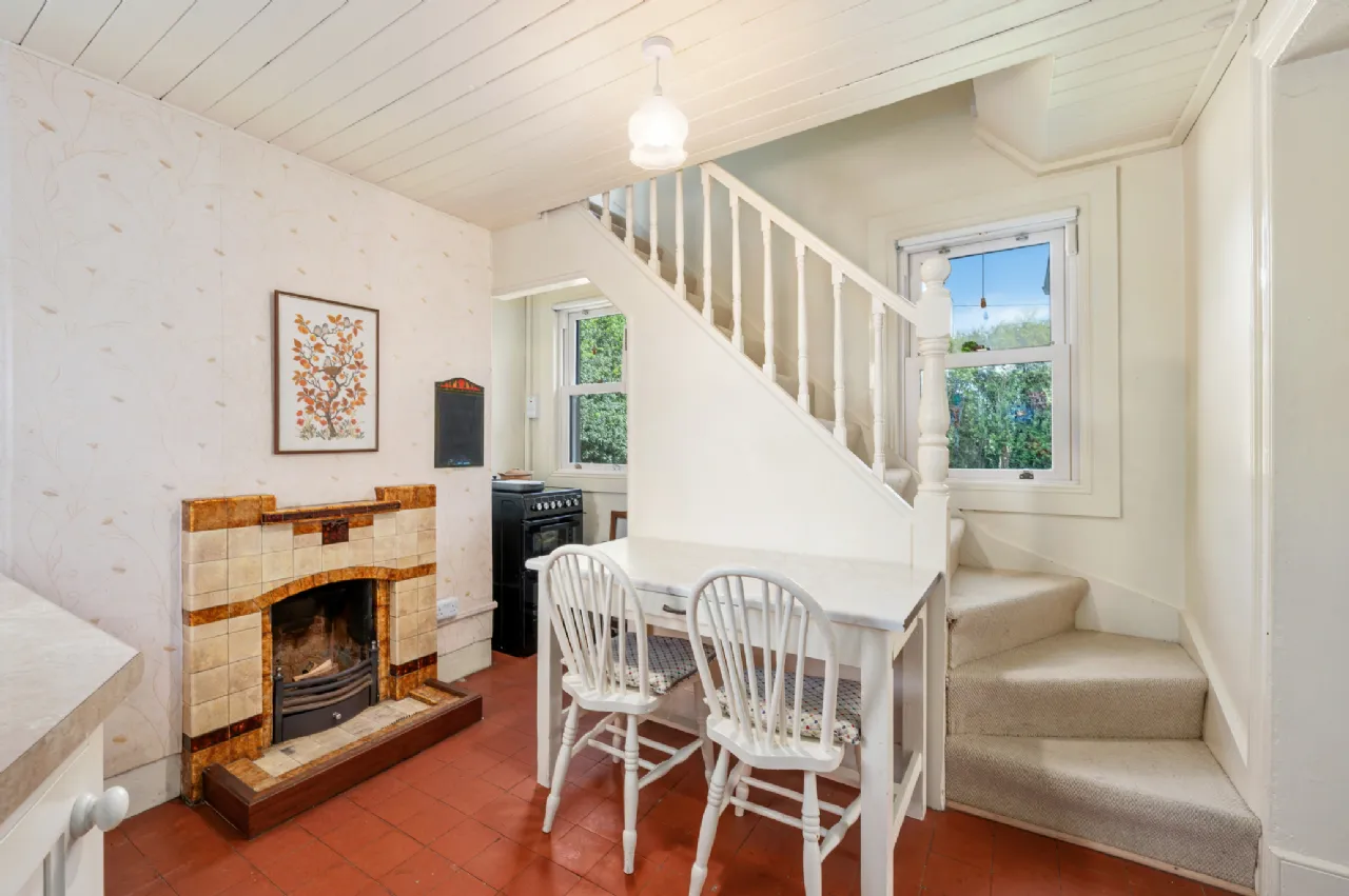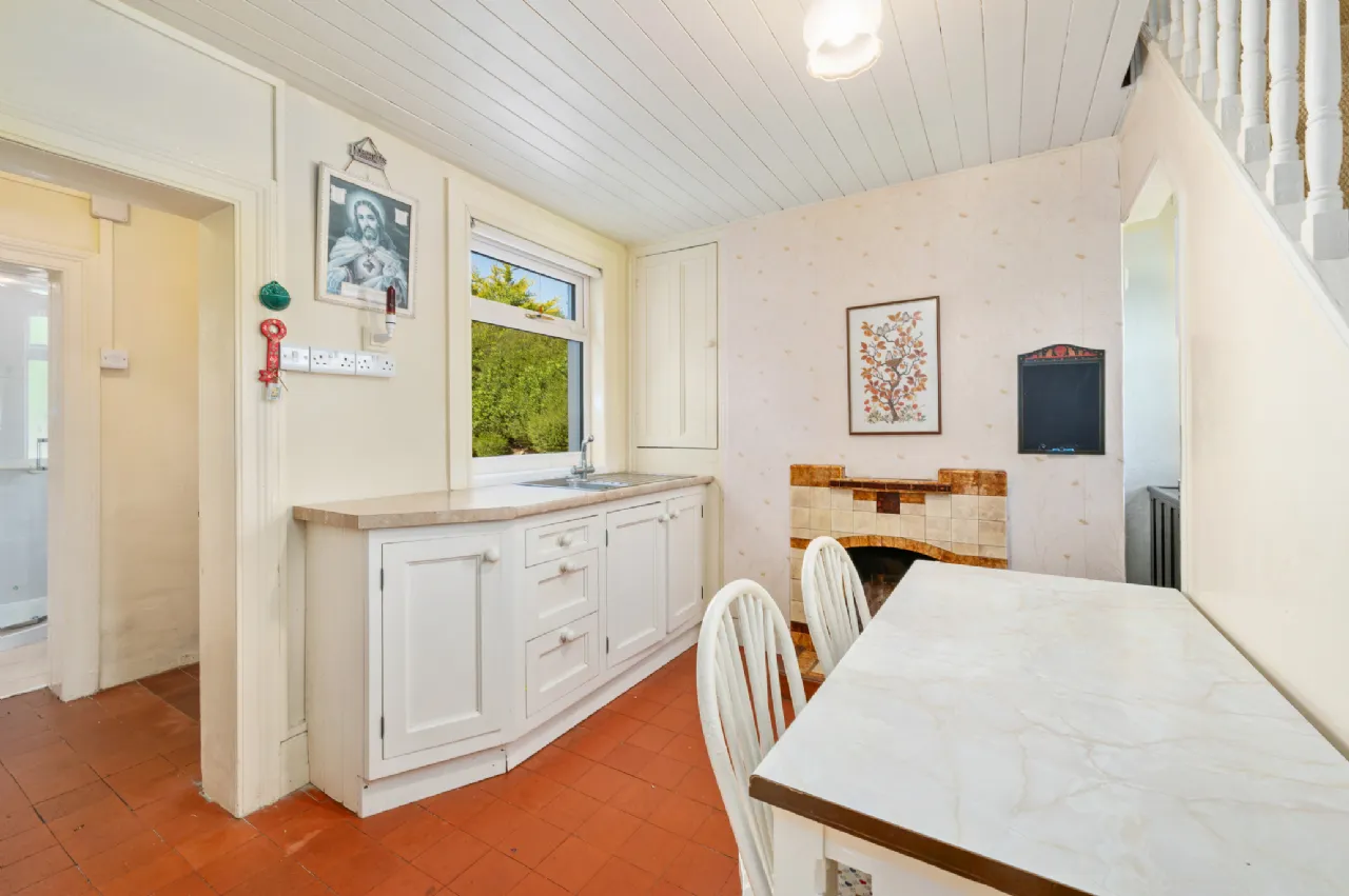 Kitchen 3.2m x 3.15m Tiled Floor. Fully fitted kitchen. Solid Fuel fire with feature surround. Stairs to Office/Study.
