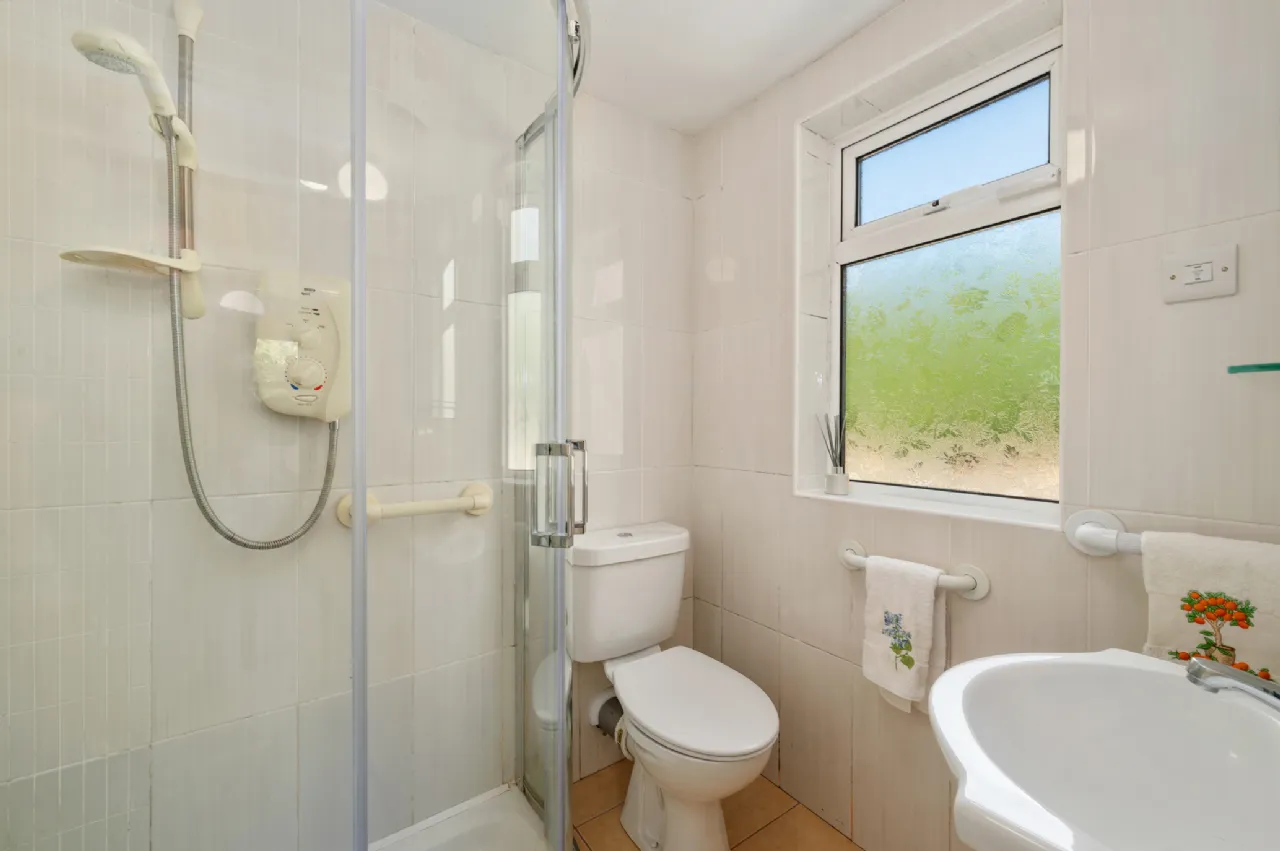 Bathroom 1.83m x 1.64m Fully tiled. Electric shower, Whb and Toilet.