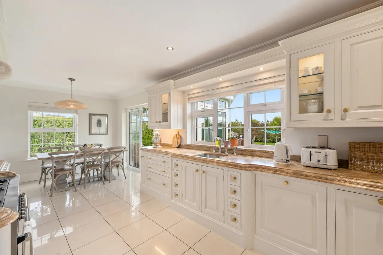 Kitchen Dining Room 3.04m x 6.98m Polished Porcelain tiled flooring. Fully Fitted solid wood Kitchen with double marble worktops. Range with feature surround. Recessed lighting. Double doors to Sun Room.