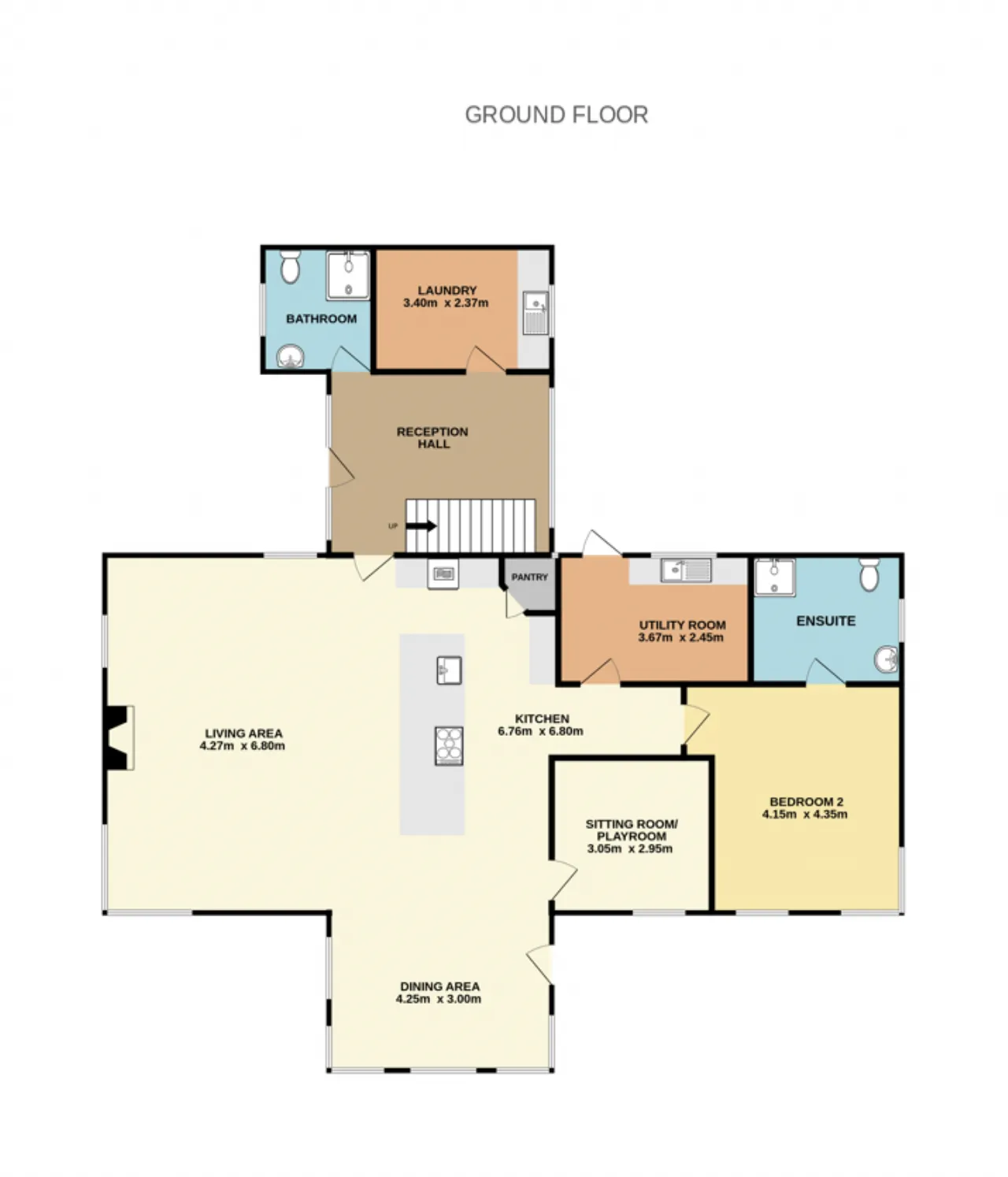 Sitting Room/Playroom 3.05m x 2.95m Situated just off the kitchen, this versatile room is currently used as an additional reception space but would equally serve as a playroom or a generous home office if desired. It is finished with industrial grade laminate flooring, a window overlooking the patio and a central light fixture, creating a bright and functional space.