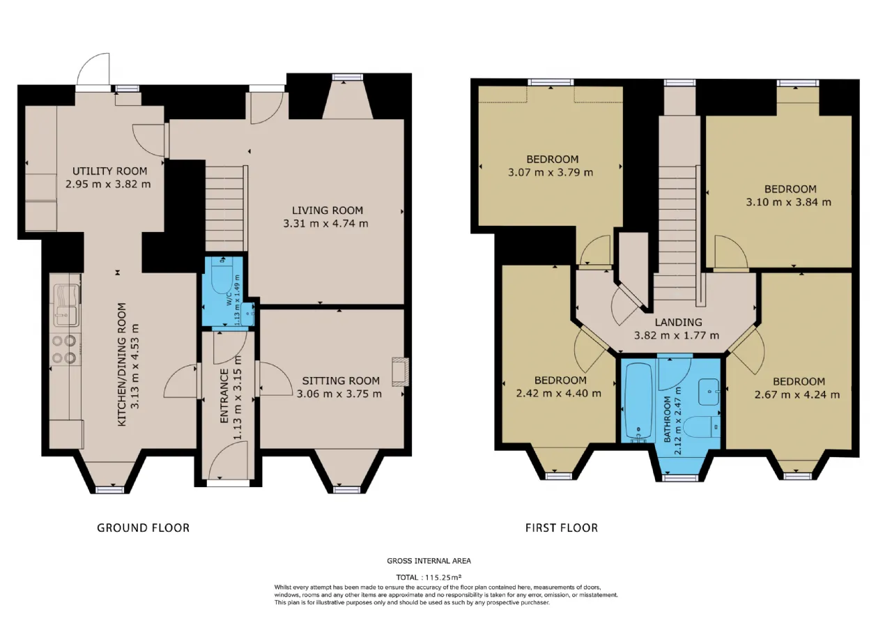 The accommodation which extends to 115.2 sq. m./1240 sq. ft. approx. includes entrance hallway, sitting room, kitchen/dining room, utility, living room and wc on the ground floor. The first floor includes 4 spacious bedrooms and a family bathroom.