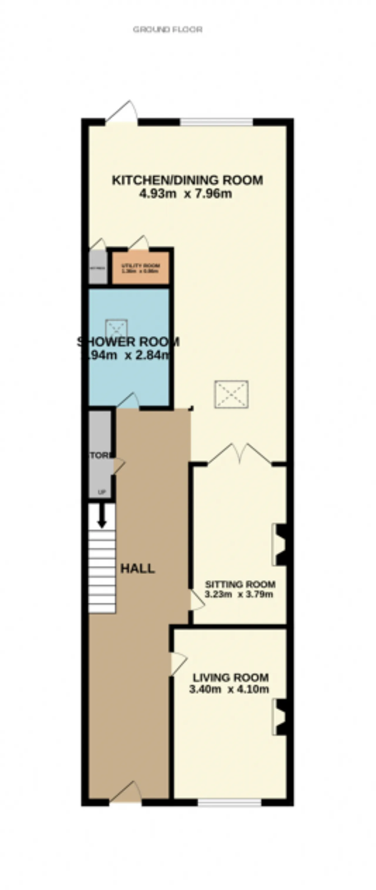 Sitting Room 3.23m x 3.79m Spacious sitting room with wooden flooring and a built-in fireplace with iron cast surround. Acts as another gateway to the kitchen via the double doors. Original stone walls.