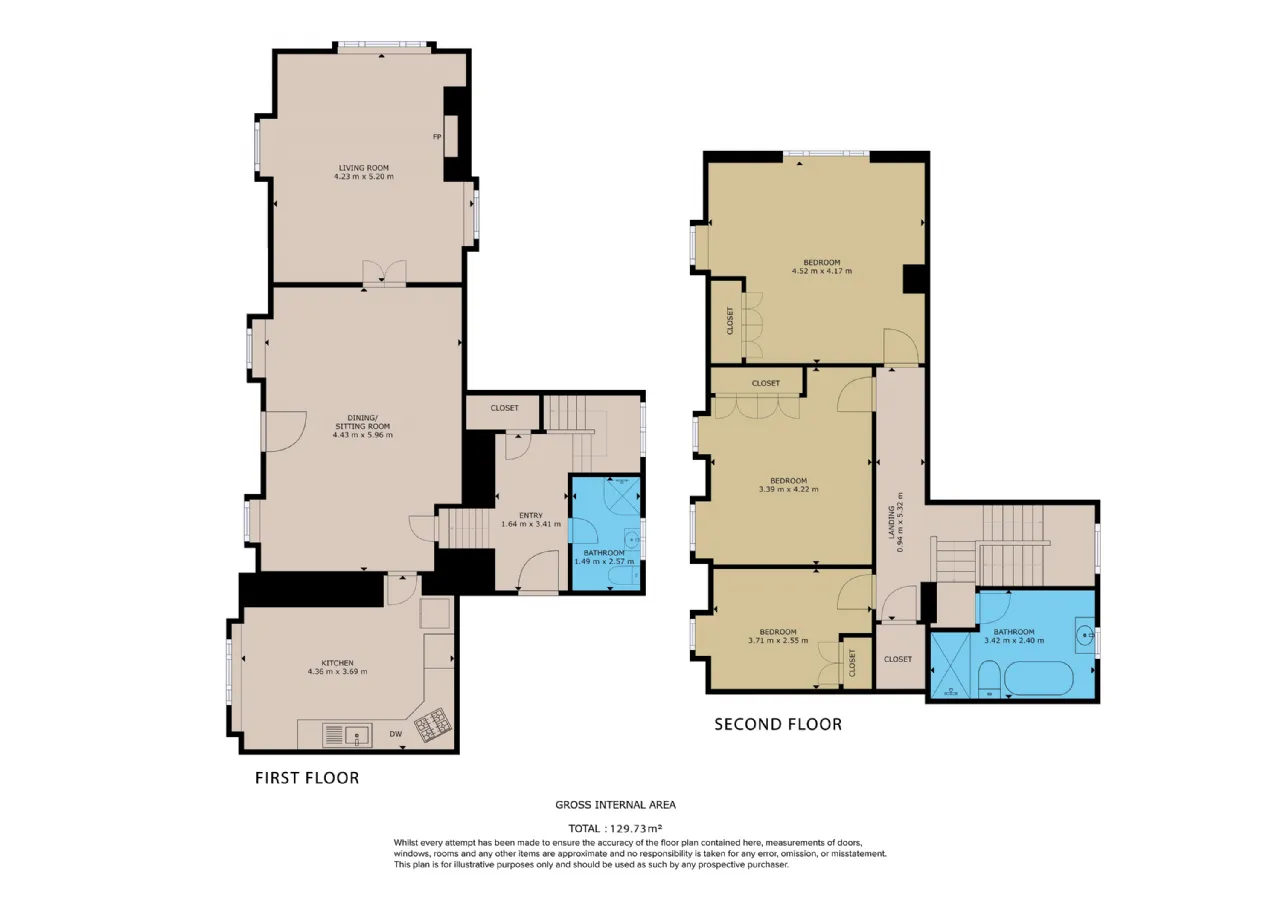 The ground floor includes a sitting room, living room, kitchen and dining area, rear hall and shower room, while upstairs there are three bedrooms and a family bathroom.
