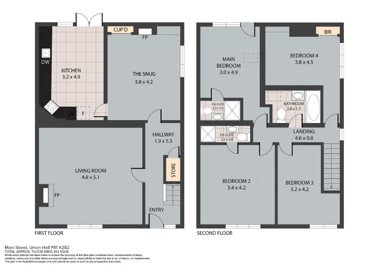 The accommodation includes entrance hall, large living room, snug and kitchen on the ground floor. There are 4 bedrooms, two ensuite and a family bathroom on the first floor. The master bedroom includes doors to a covered outside balcony area.