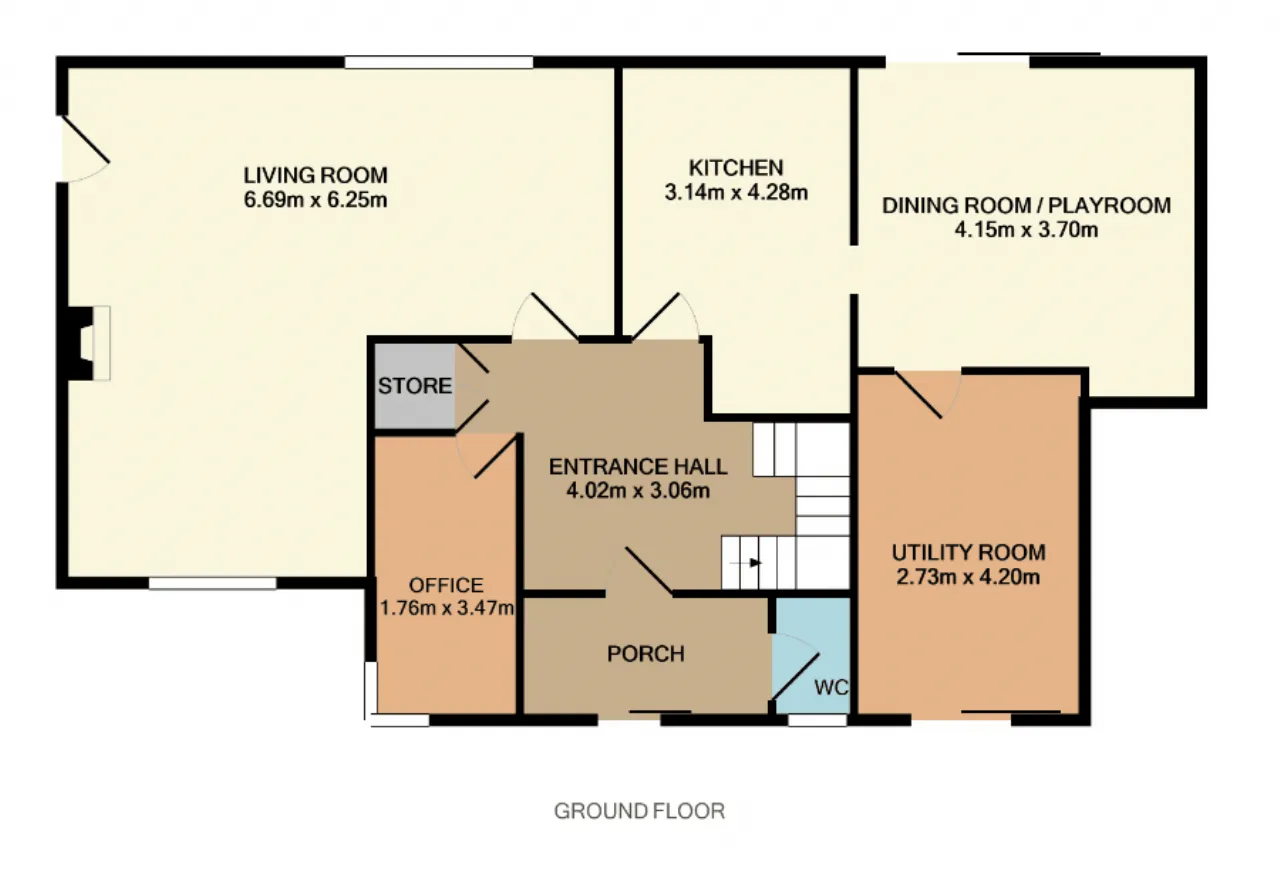 Internally, there is a lovely balance of living and bedroom accommodation with a porch, wc, entrance hall, living & dining room, double home office, kitchen with adjacent play room and a large utility room on the ground floor, with four nicely sized bedrooms and a main bathroom overhead.