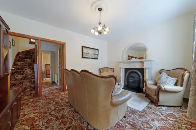 Living Room 4.3 x 3.6 Carpet covering on floor. Cast iron fireplace with marble surround and overmantle mirror. Door connecting through to kitchen/dining area. Staircase leading to first floor.