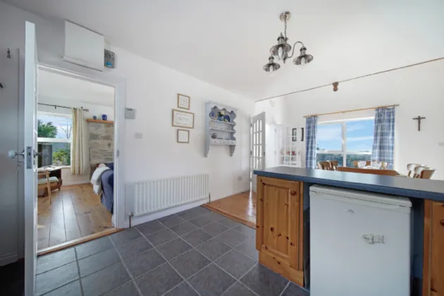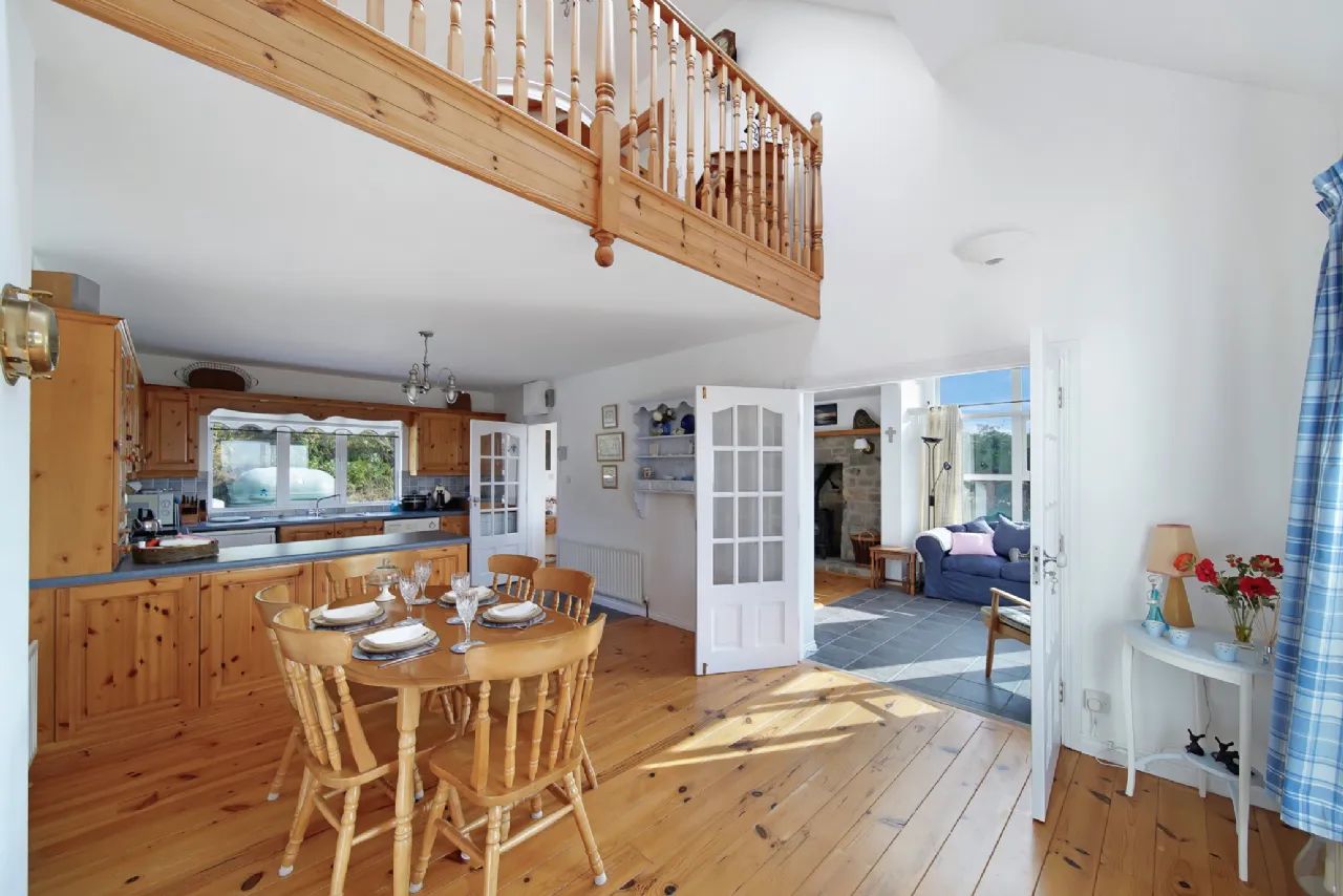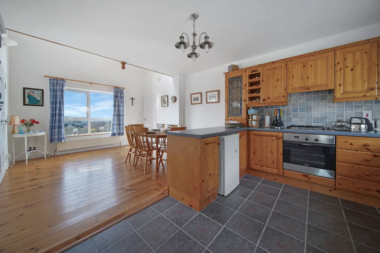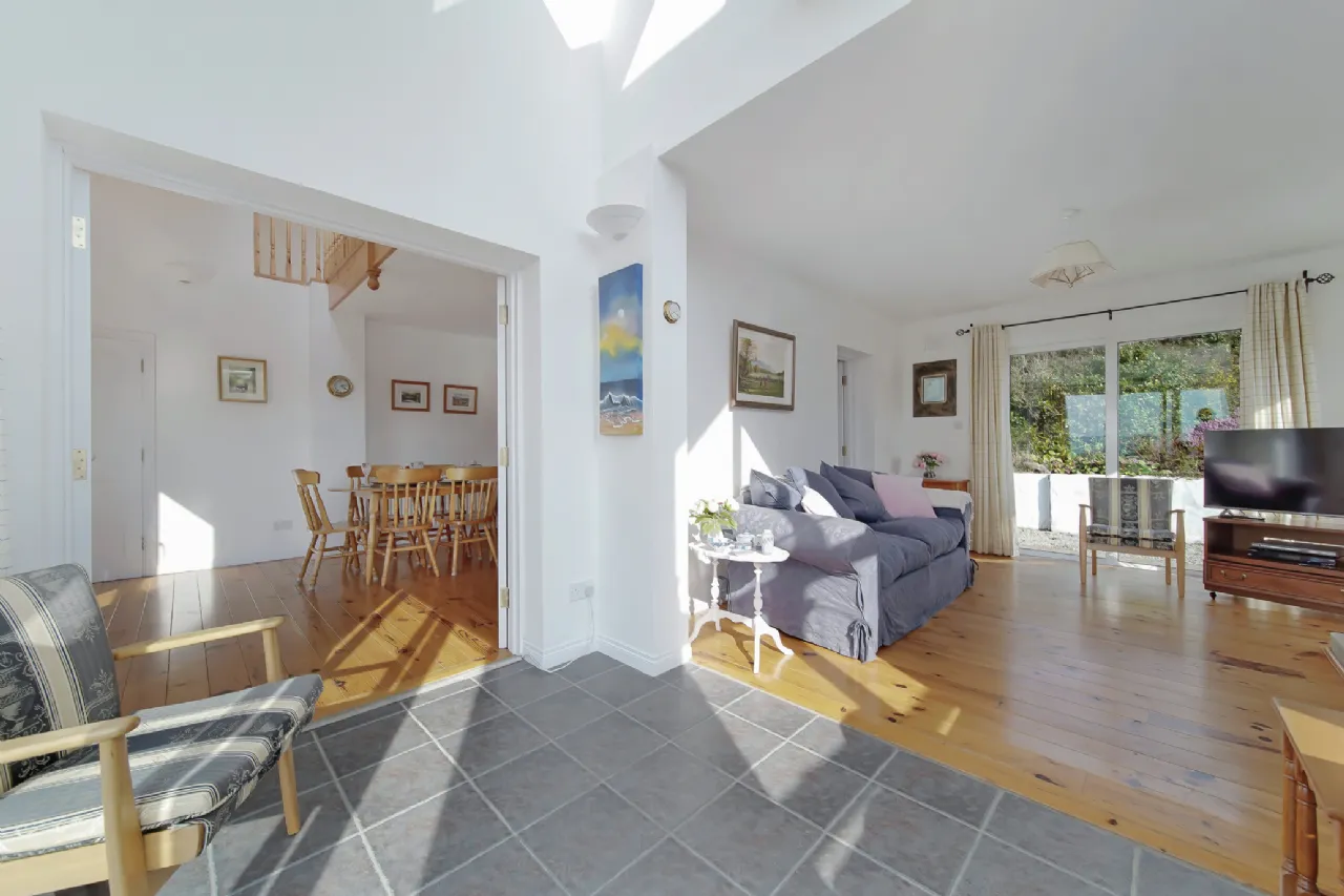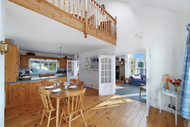 Kitchen/Dining Area 6.7 x 3.8 Tiled flooring in kitchen area. Eye and low level timber units with inset lighting and single drainer sink. Built in oven with four ring hob and overhead extractor fan. Plumbed for dishwasher and washing machine/tumble dryer. Pine flooring in dining area. Feature high vaulted ceiling with velux window.. Double glass doors leading to Living Room.