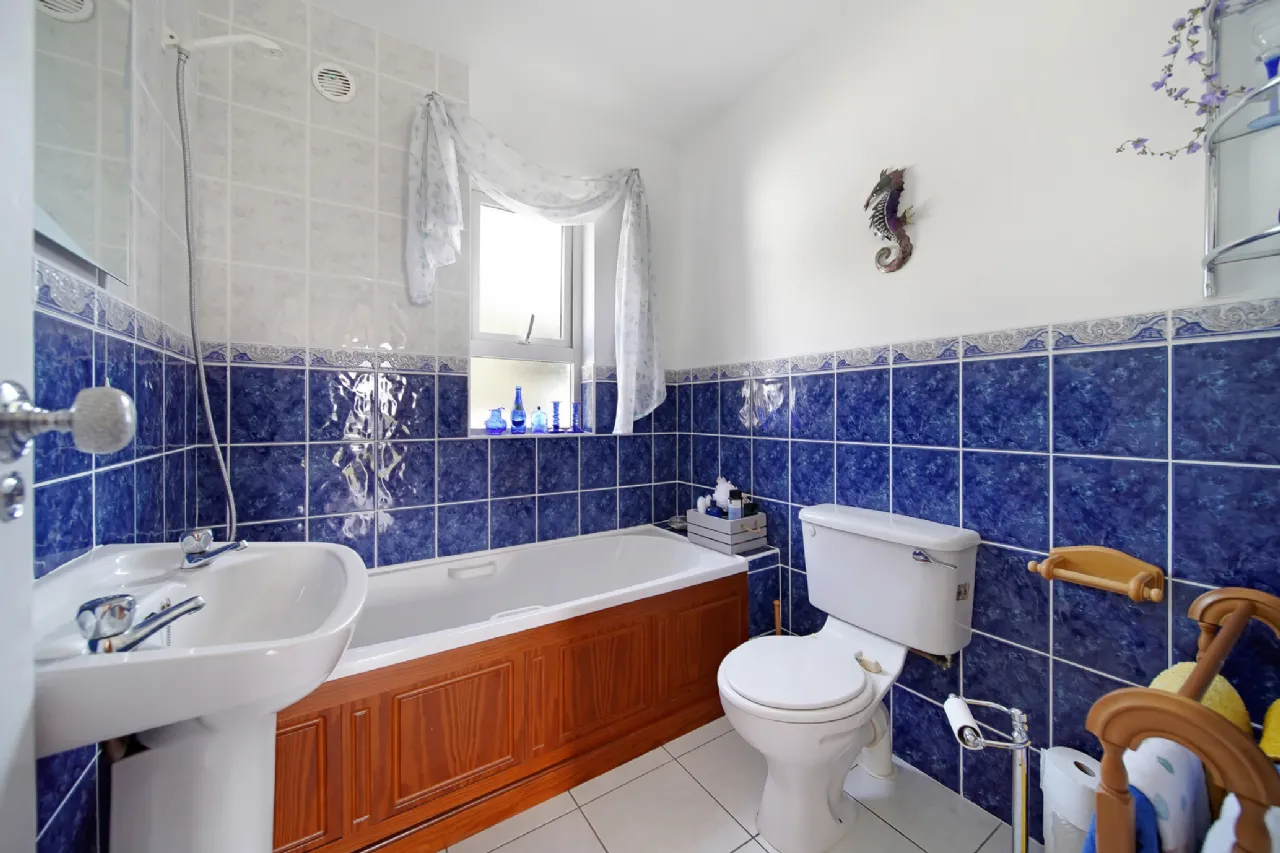 Bathroom 2.0 x 1.8 Tiled flooring and walls partially tiled. Comprising w.c, wash hand basin and bath with shower overhead.