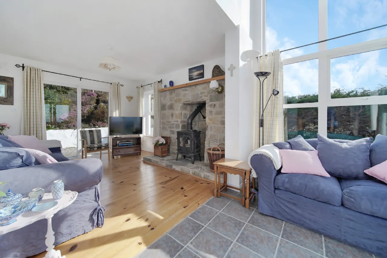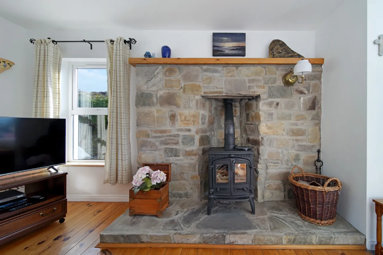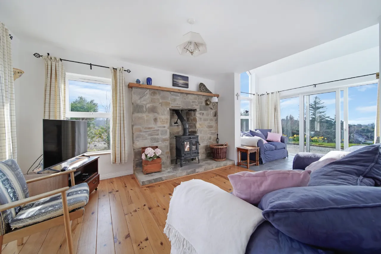 Living Room 6.7 x 3.7 Pine flooring. Feature stone built fireplace with inset solid fuel burning stove. Double patio doors leading to front of property.