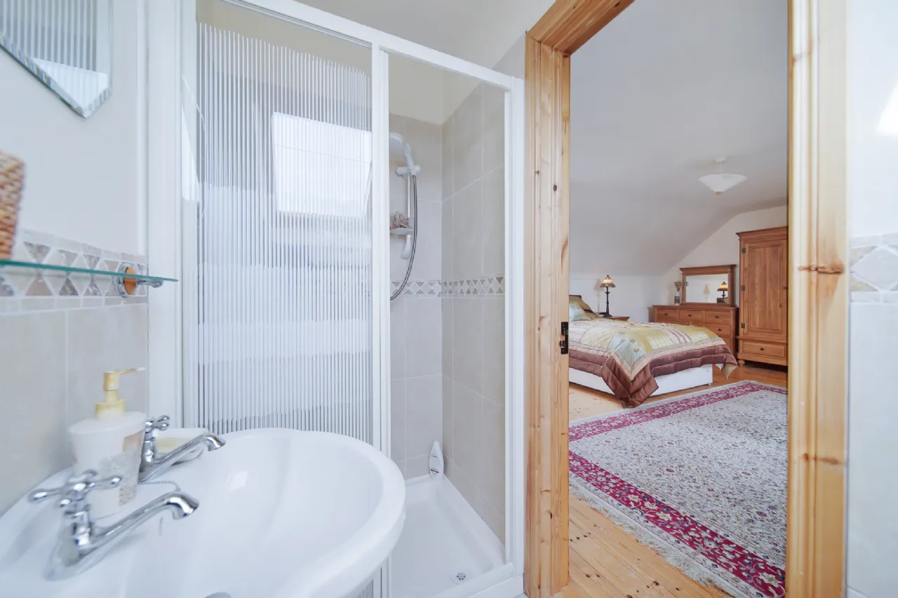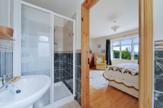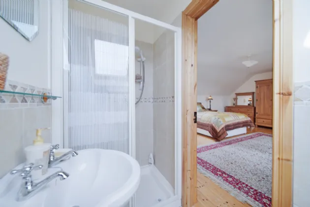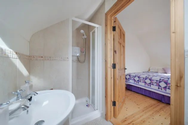 Ensuite Tiled flooring and partially tiled walls. Comprising wc, wash hand basin and electric shower.