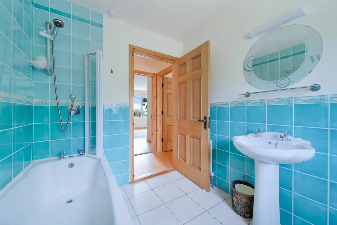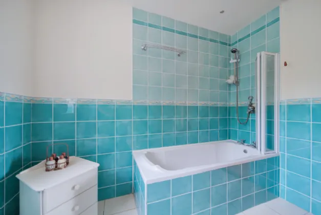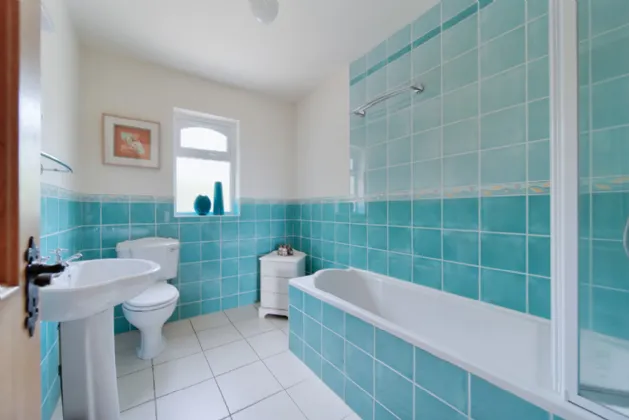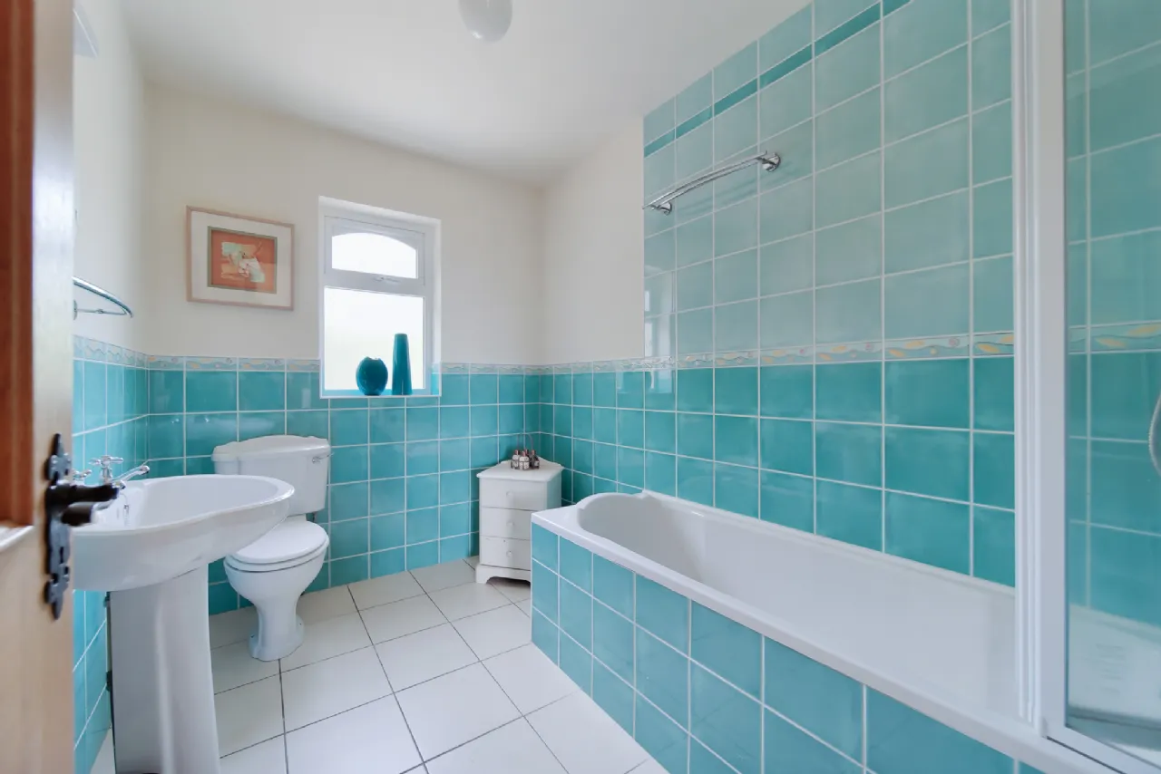 Bathroom 2.7 x 2.0 Tiled flooring and partially tiled walls. Comprising w.c, wash hand basin and bath with shower over.