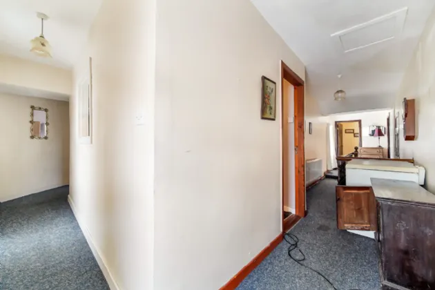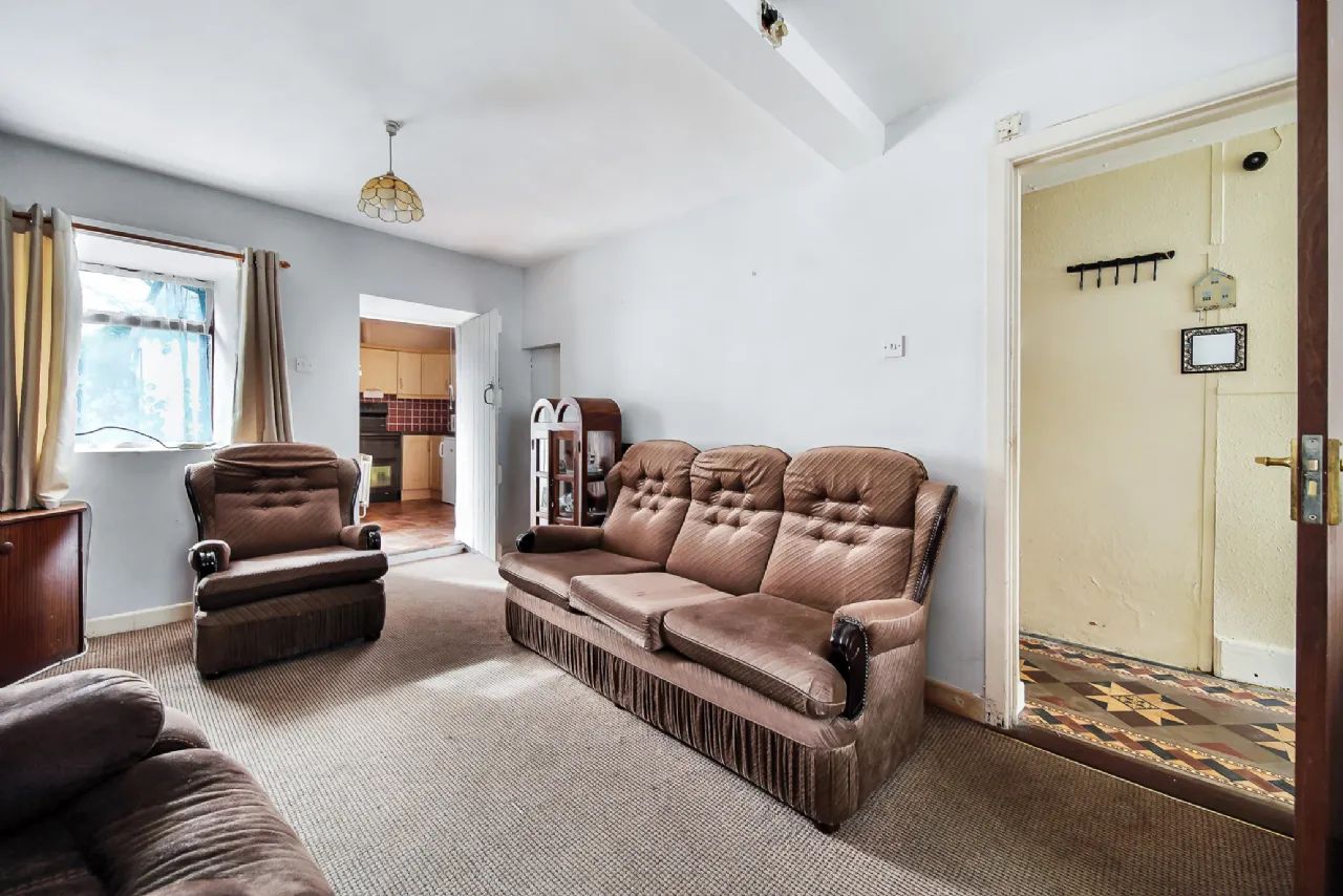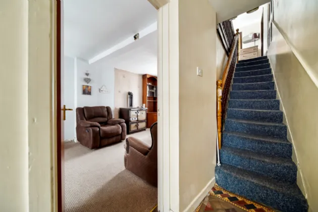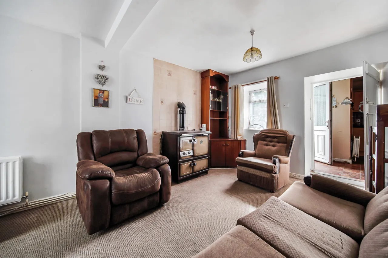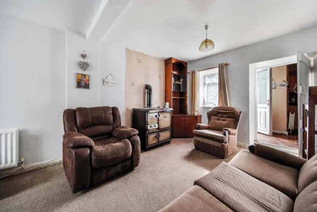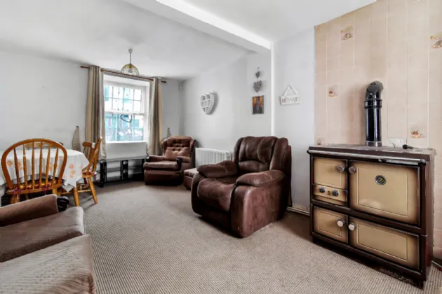 Living Room 6.3m x 3.1m Carpet covering on floor. Oil fired Stanley range.