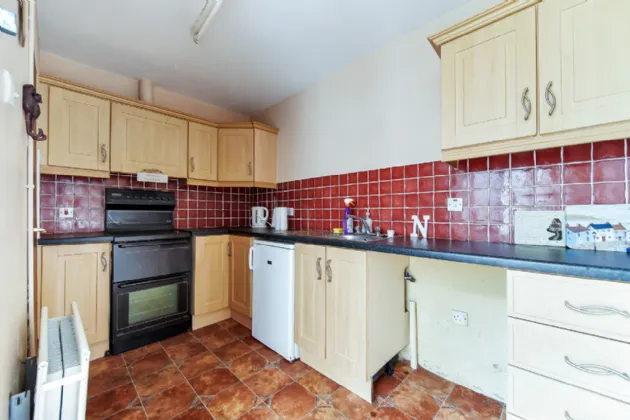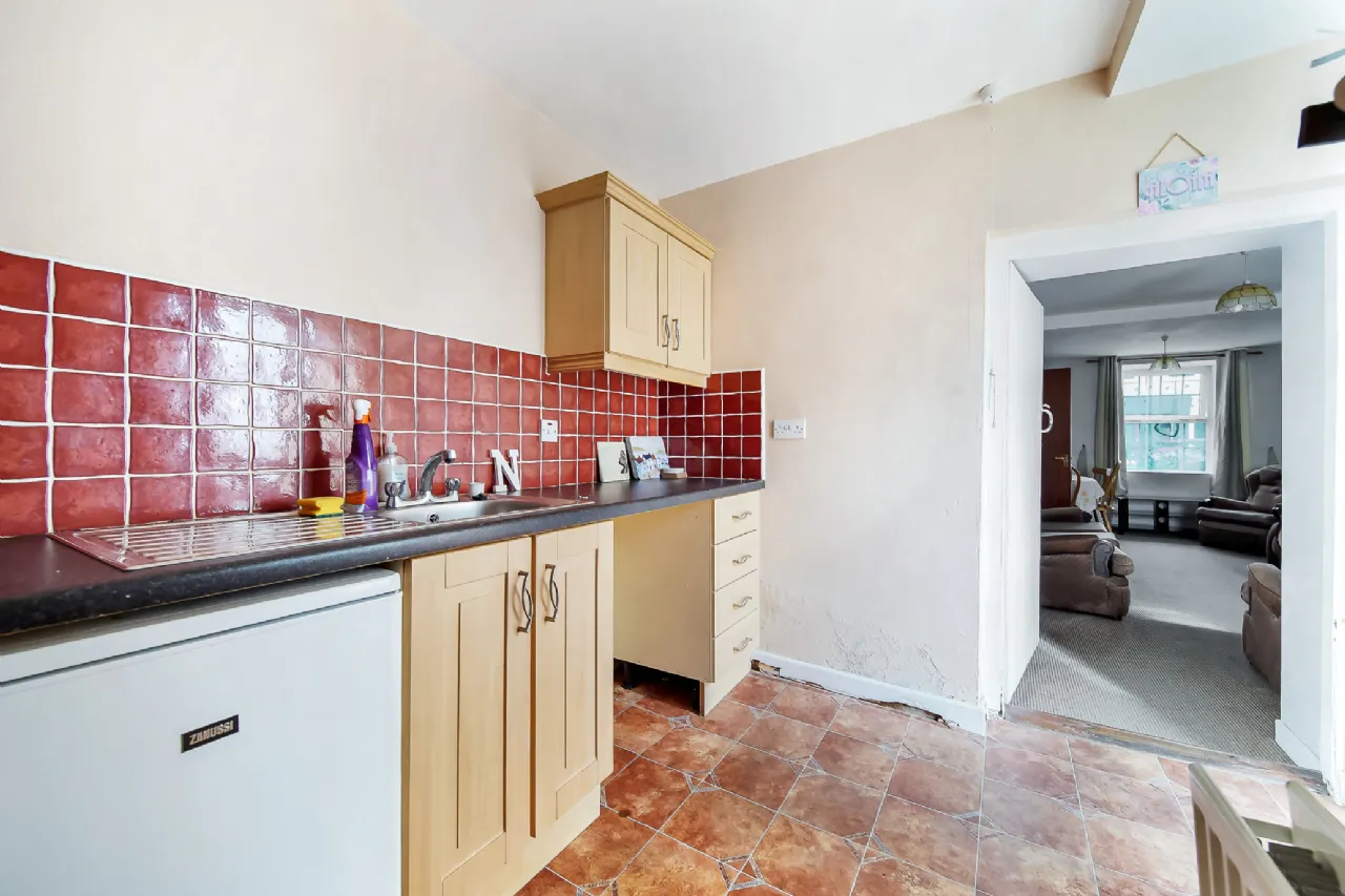 Kitchen 3.3m x 2.8m Linoleum covering on floor. Eye and low level units with single drainer sink and tiled splash back. Door leading to rear courtyard.