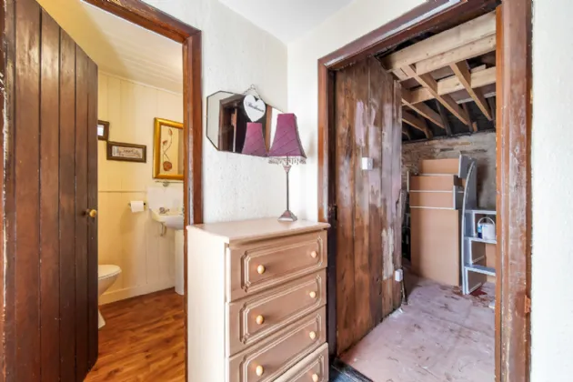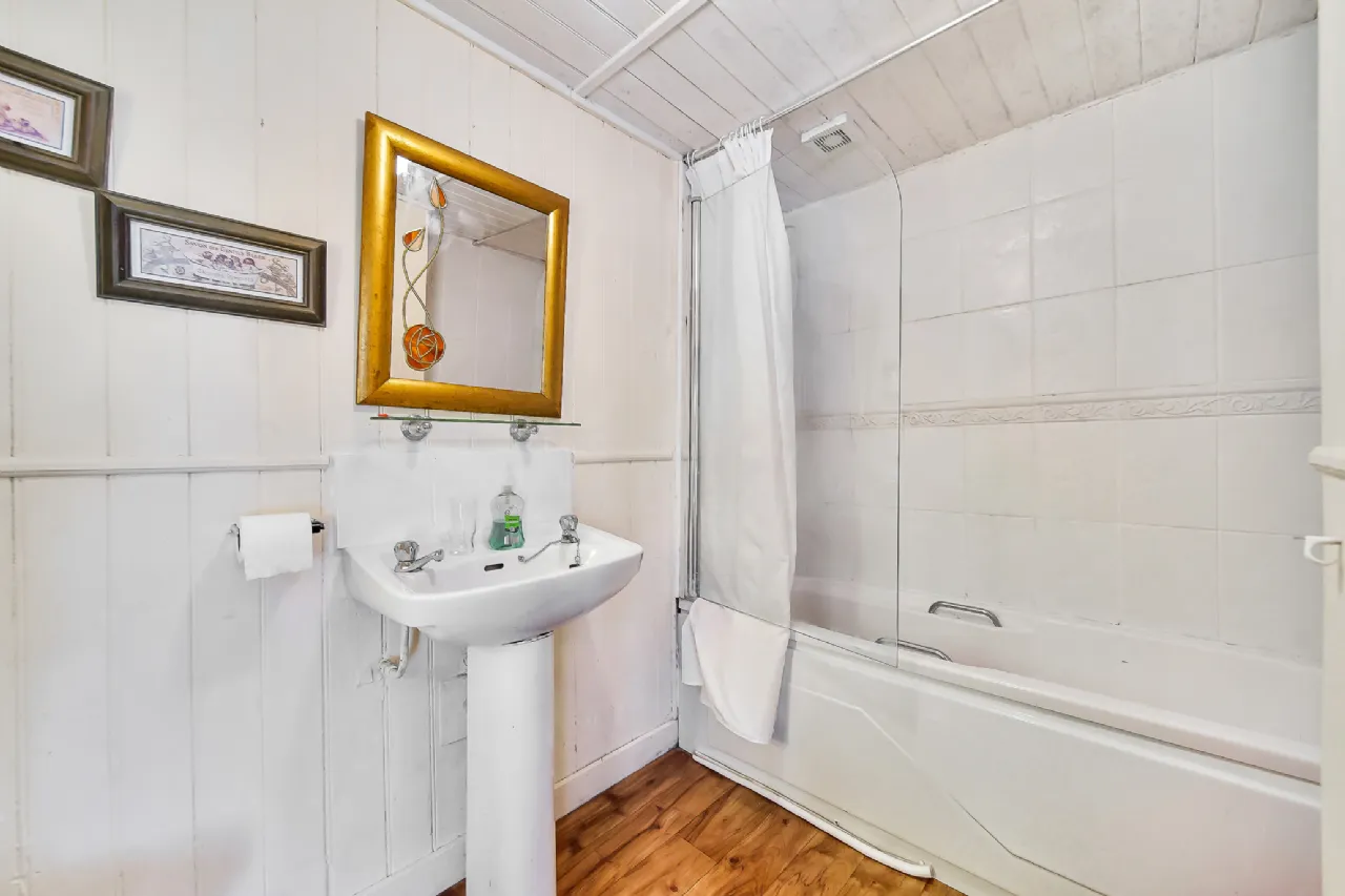 Bathroom 2.7m x 1.7m Timber flooring and tiled walls. Comprising w,c wash hand basin and bath with overhead shower.