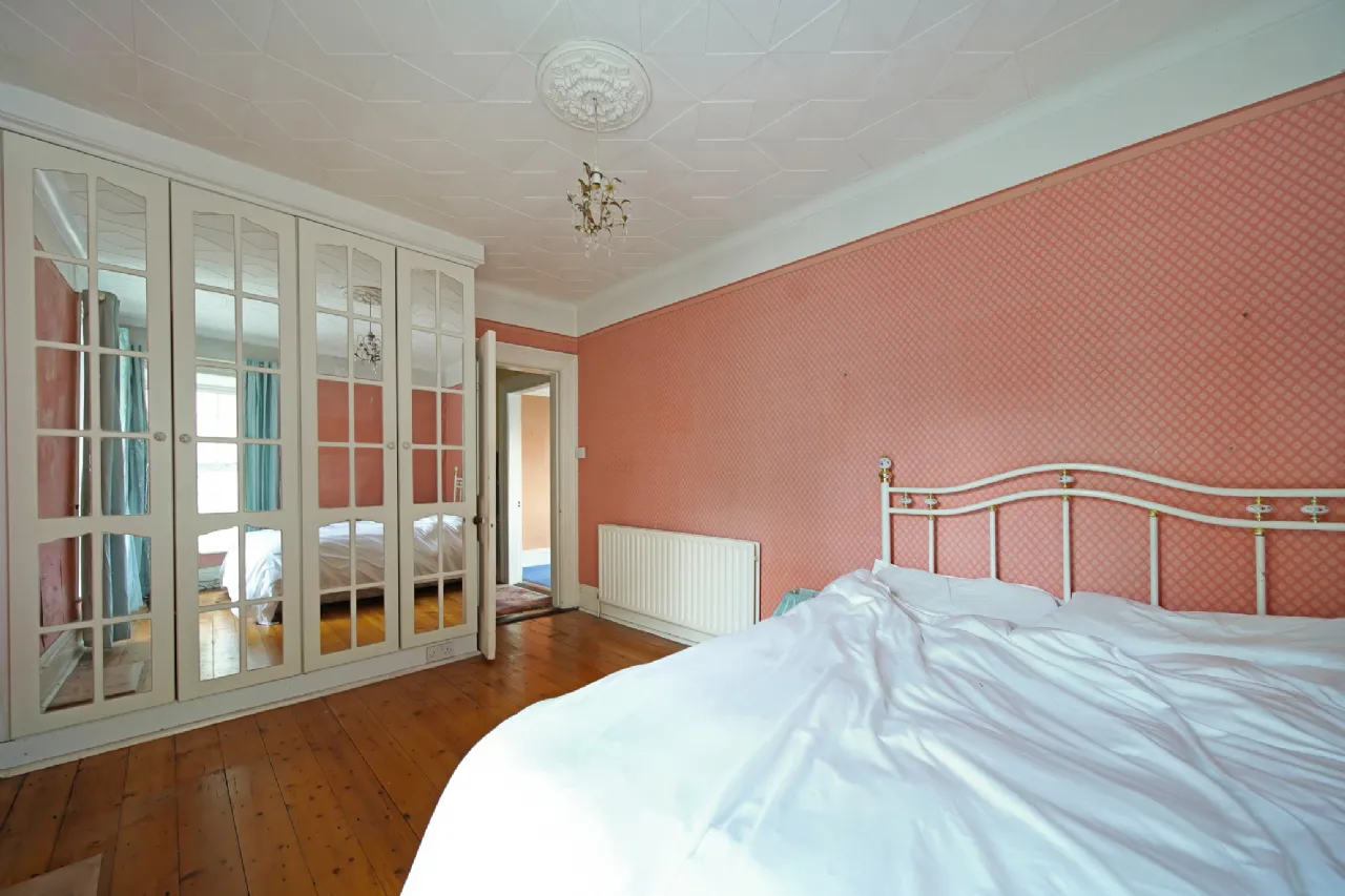 Bedroom 2 4.6 x 3.0 Wooden flooring. Built in wardrobe. Coving and ceiling rose.